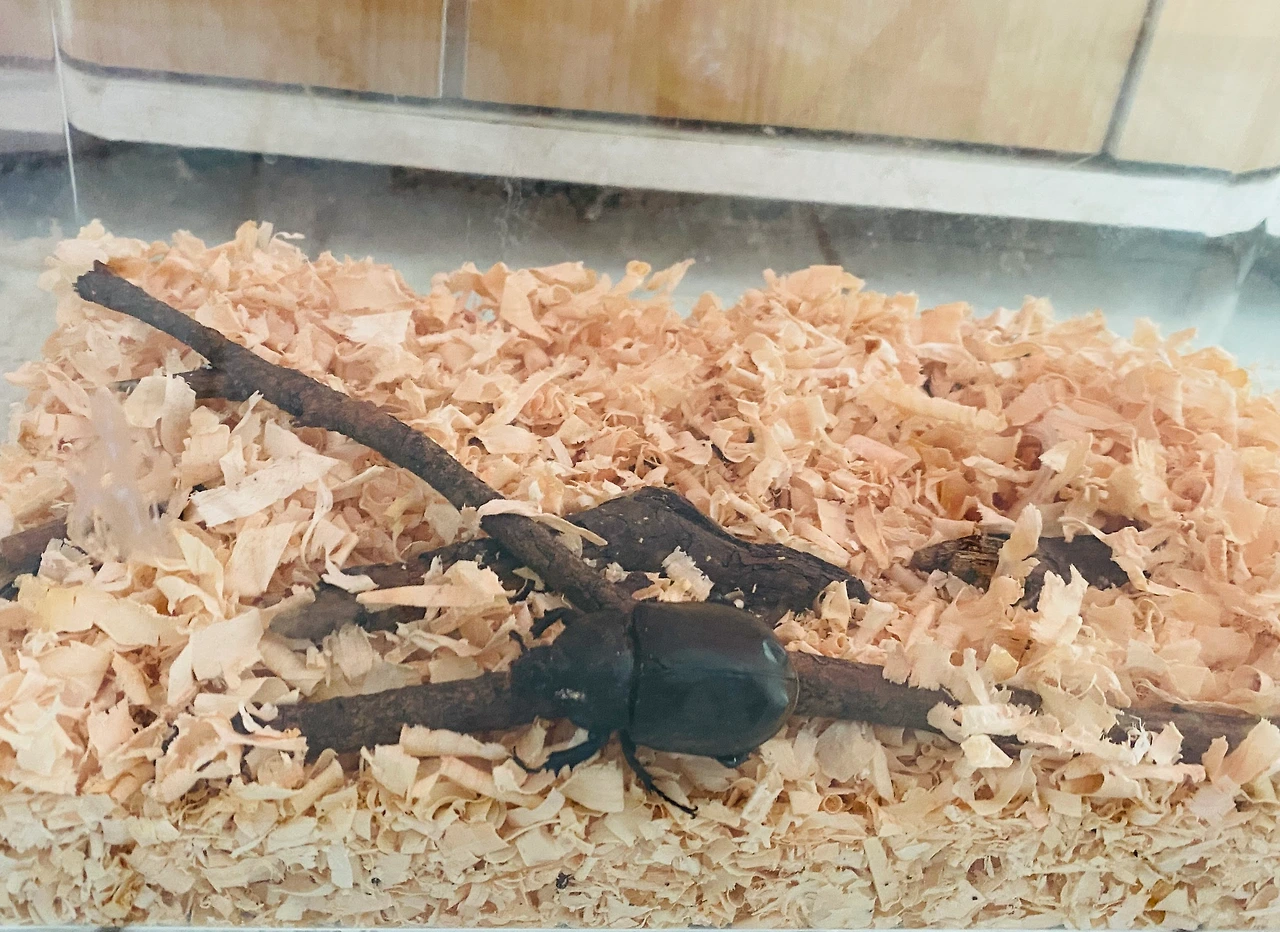 그리고 드디어 예쁜 장수풍뎅이가 되었다. 그렇다, 우리 장풍이는 암컷이었다. 우리 아이가 상상한 멋진 뿔이 없어서 쪼금 실망했지만, 그래도 자기가 키워서 그런지 엄청 애지중지했다. 지인이 햄스터함(?)을 줘서, 톱밥을 깔고(원래는 흙이 좋은데, 그냥 있는 거 깔아줌), 장풍이가 좋아한다는 참나무 가지를 깔아줬다. 아 그리고 중요한 밥! 이미 아이가 다 커버려 곤충젤리가 필요 없는 집에서 받아왔다. 무작정 사지 말고, 주변에 꼭 물어보시라. 어쩌지 못한 곤충젤리가 은근히 많이 굴러다닌다.