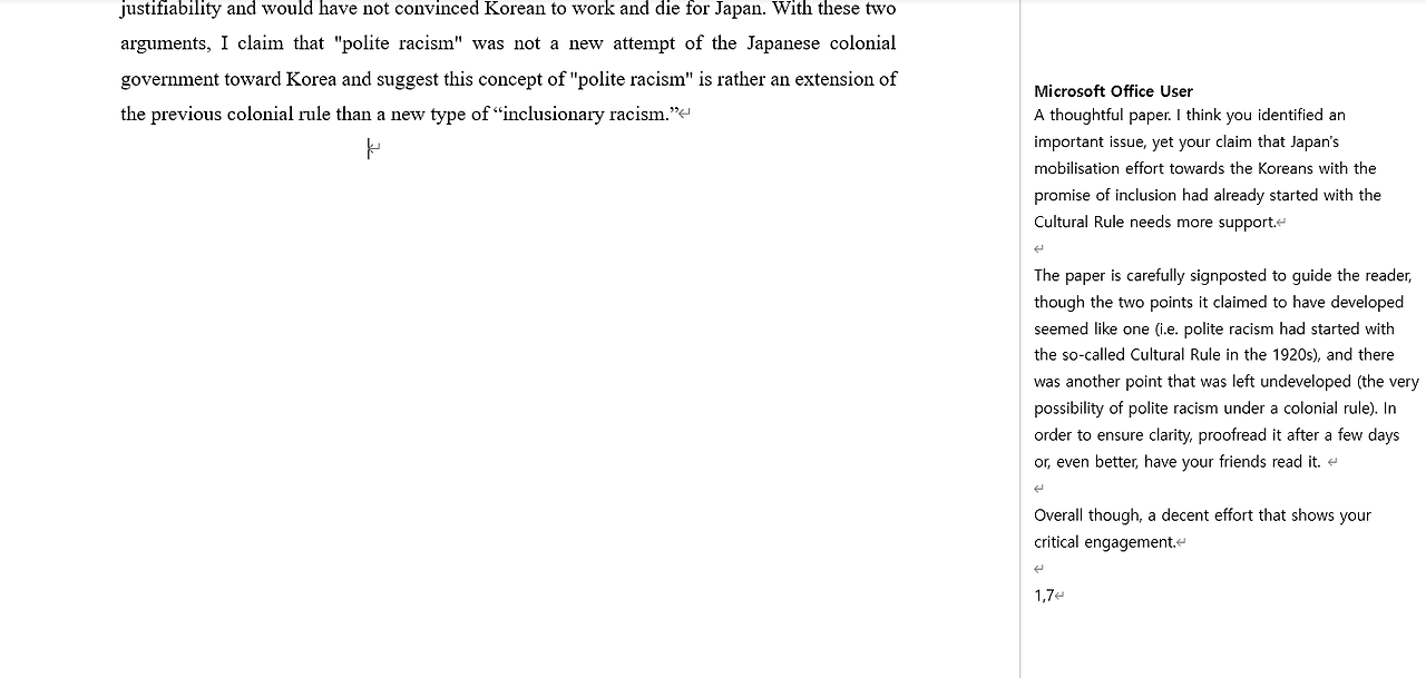 크리스마스 방학 전에 제출했던 중간고사 페이퍼의 성적이 나왔다. 한국에서는 좋은 성적만 받아왔기에 A-로 환산되는 1,7점을 받은 것이 마냥 만족스럽지는 않다. 그래도 힘들어했던 것 치고는 나쁘지 않다고 스스로 위안하며, 앞으로 더 나은 결과물을 낼 수 있도록 그동안 교수님들로부터 받았던 피드백을 정리하고자 한다.
