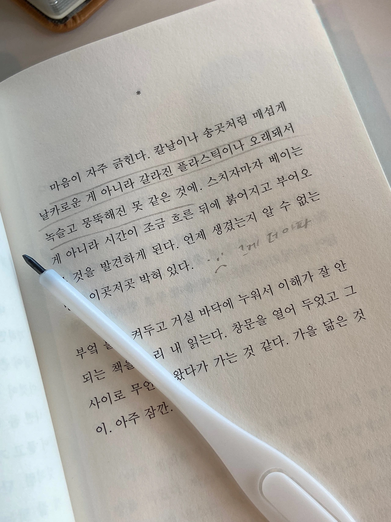 - 모든 미련은 원래 상태로 돌아가고자 하는 마음으로부터 생긴다. 새것에 대한 미련을 좀 버리기로 해. 책 모서리를 접는 삶도 나쁘지 않았다.