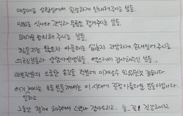 한 번은 생활치료센터에 입소 중인 환자 뿐만 아니라 그곳에서 근무하는 의사, 간호사, 행정직원들도 답답하기는 마찬가지다. 그럼에도 환자들과 직원들은 서로를 격려하며 잘 버텨냈다. 생활치료센터의 전반적인 현황을 파악하면서 알게 된 것은 정말 많은 감사편지가 오고 갔다는 사실이었다. 아래는 환자들이 직원들에게 보낸 편지의 일부이다.