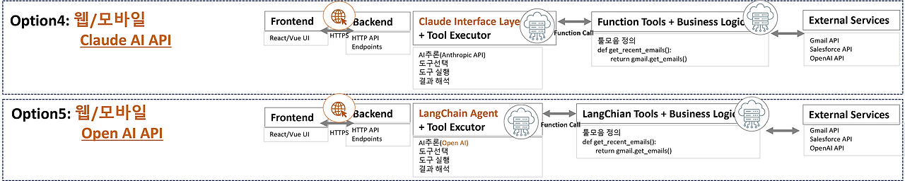 이미지의 3-3 옵션4와 옵션5 (Web/Mobile Claude AI API , Open AI +Langchain)을 주목해 주세요.