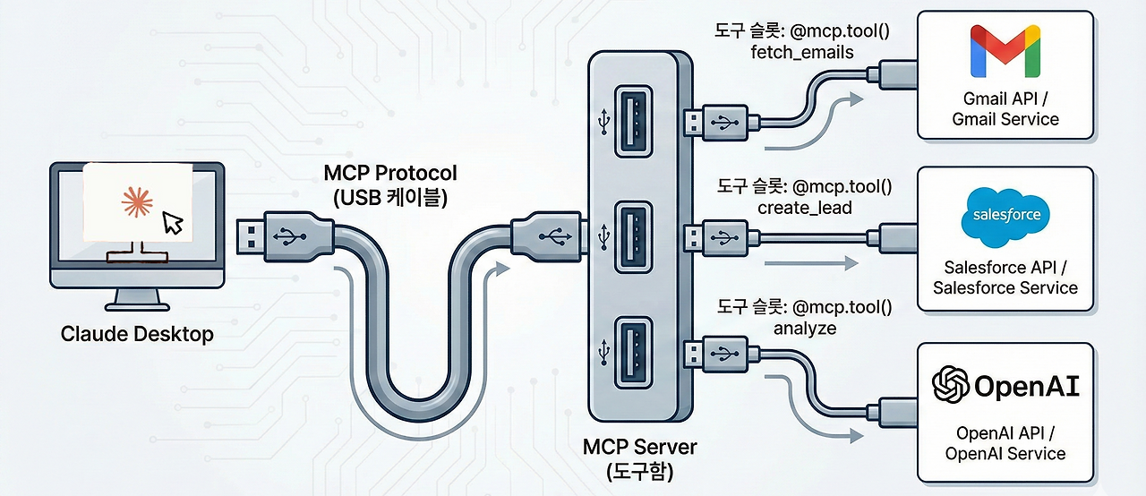 Claude Desktop과 MCP Server가 마치 USB 케이블처럼 연결되어 있는 것을 볼 수 있습니다. 이것이 바로 MCP(Model Context Protocol)의 핵심이자 한계입니다.
