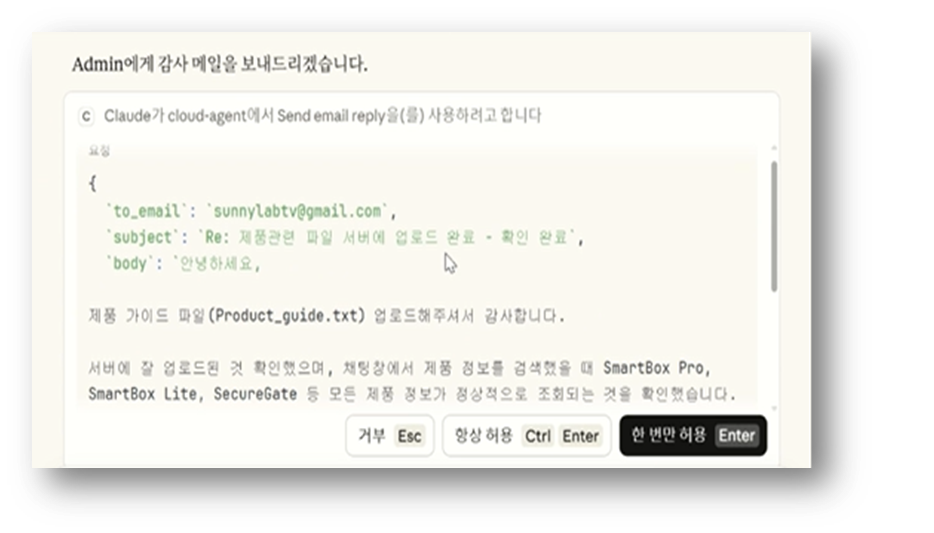 다행히, 앤스로픽(Anthropic)의 기본 설정은, 시스템이 '쓰기(Write)', '삭제(Delete)', '전송(Sending)' 같은 위험한 동작을 수행하려 할 때는 반드시 사용자에게 승인 팝업을 띄우게 했습니다. 추가 승인 로직을 강제화 하지 않아도 됬습니다.