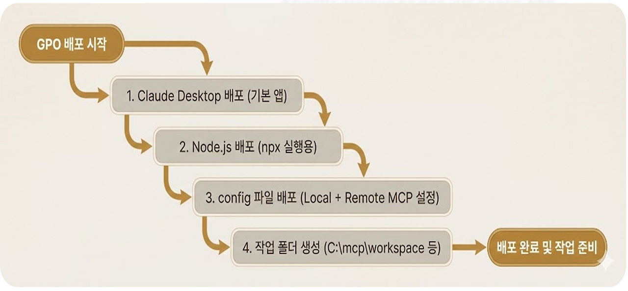 자동화의 흐름: 중앙 서버에서 정책을 배포하면, 직원들이 PC를 켜는 순간 'Claude Desktop'과 'Node.js'가 자동으로 설치되고, 미리 설정한 'Local + Remote MCP' 환경 설정 파일(config)이 해당 경로에 딱 들어맞게 전달됩니다.