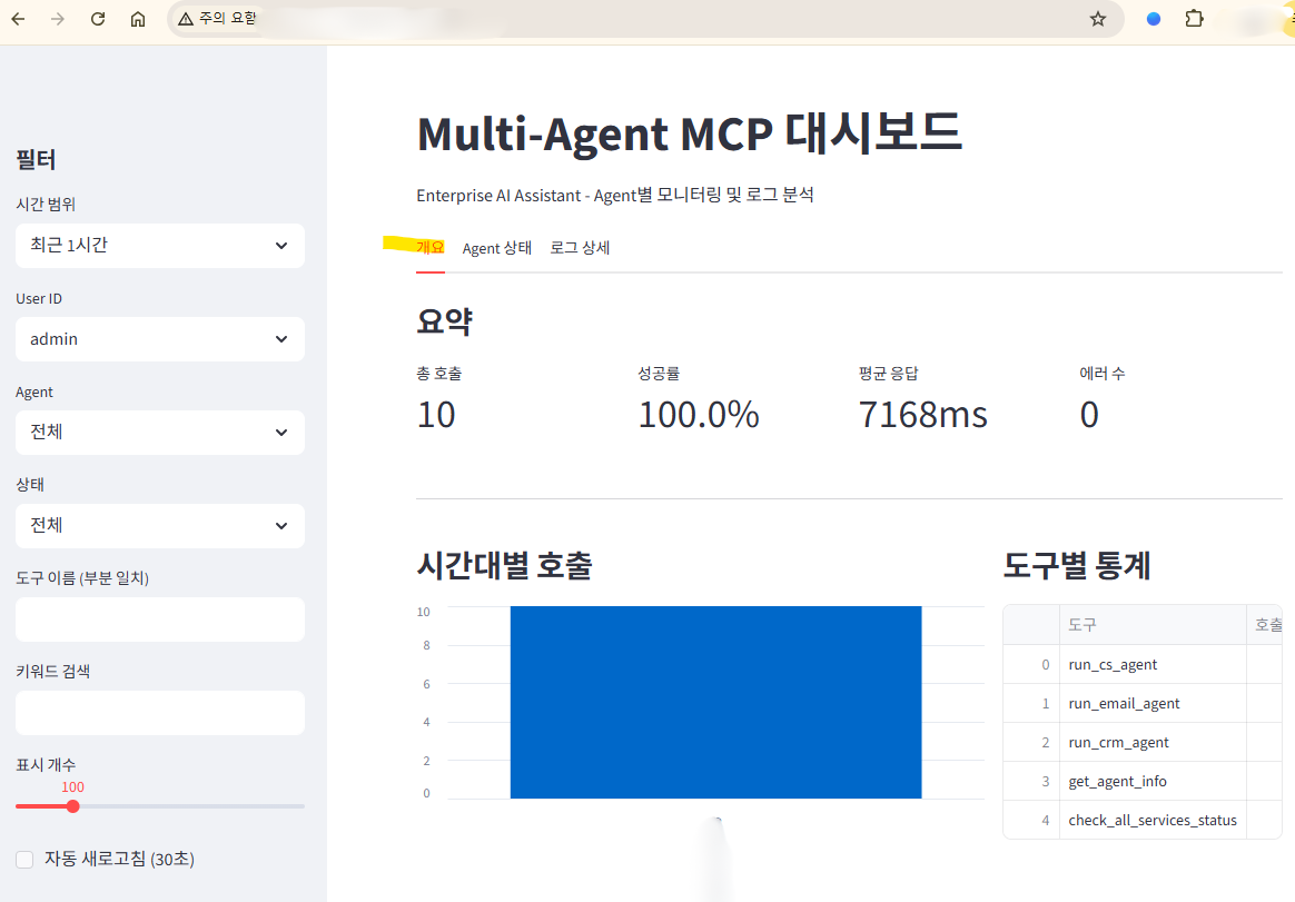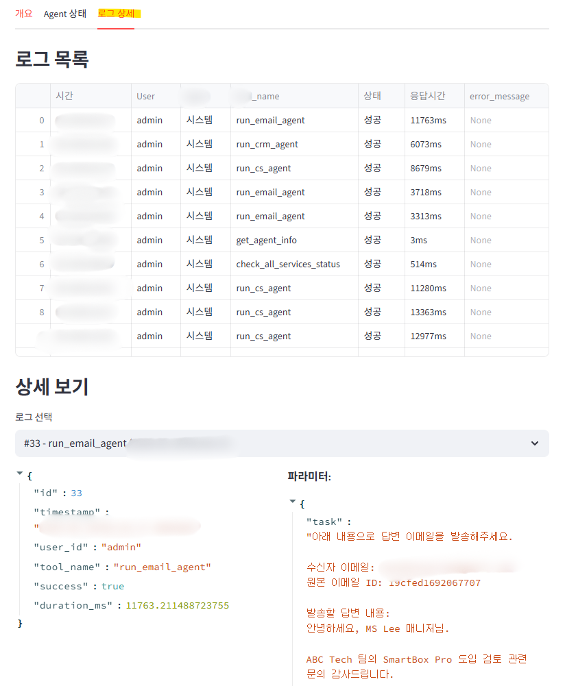 특히 'Agent별 상태' 탭은 각 부서(전문 비서)의 상태를 명확히 보여줍니다. 이메일 비서가 오늘 12건의 메일을 완벽하게 처리했는지, 고객 관리 비서가 업무 처리 중 오류를 겪지는 않았는지 상태를 직관적으로 알려주죠.