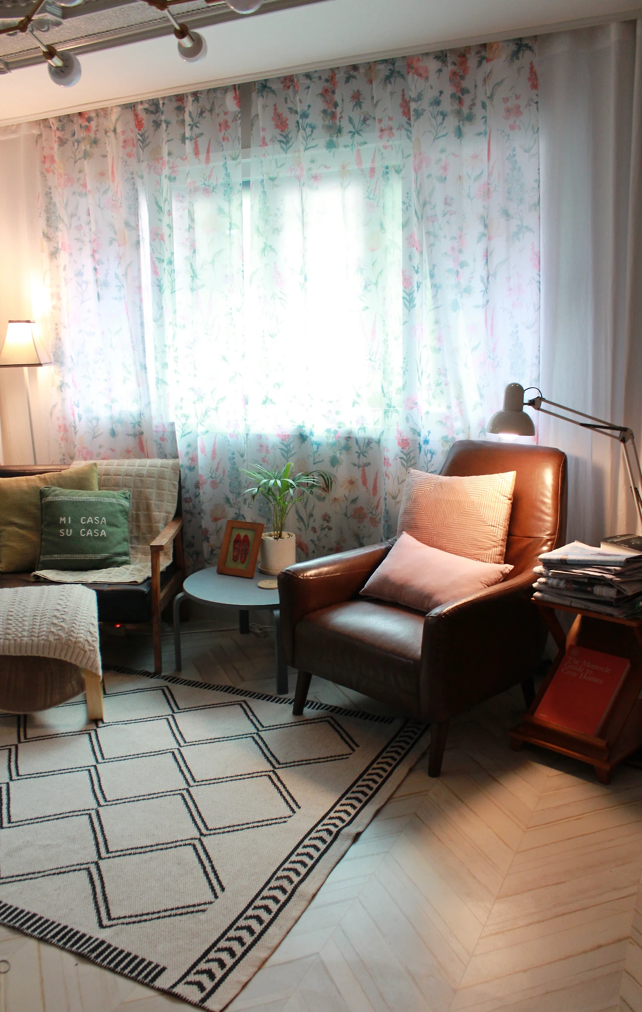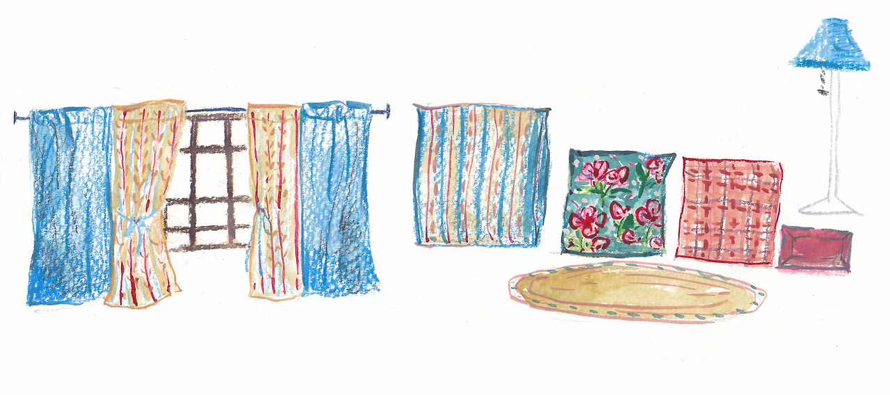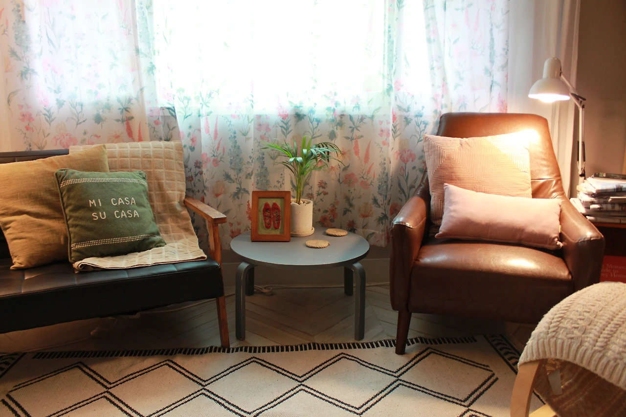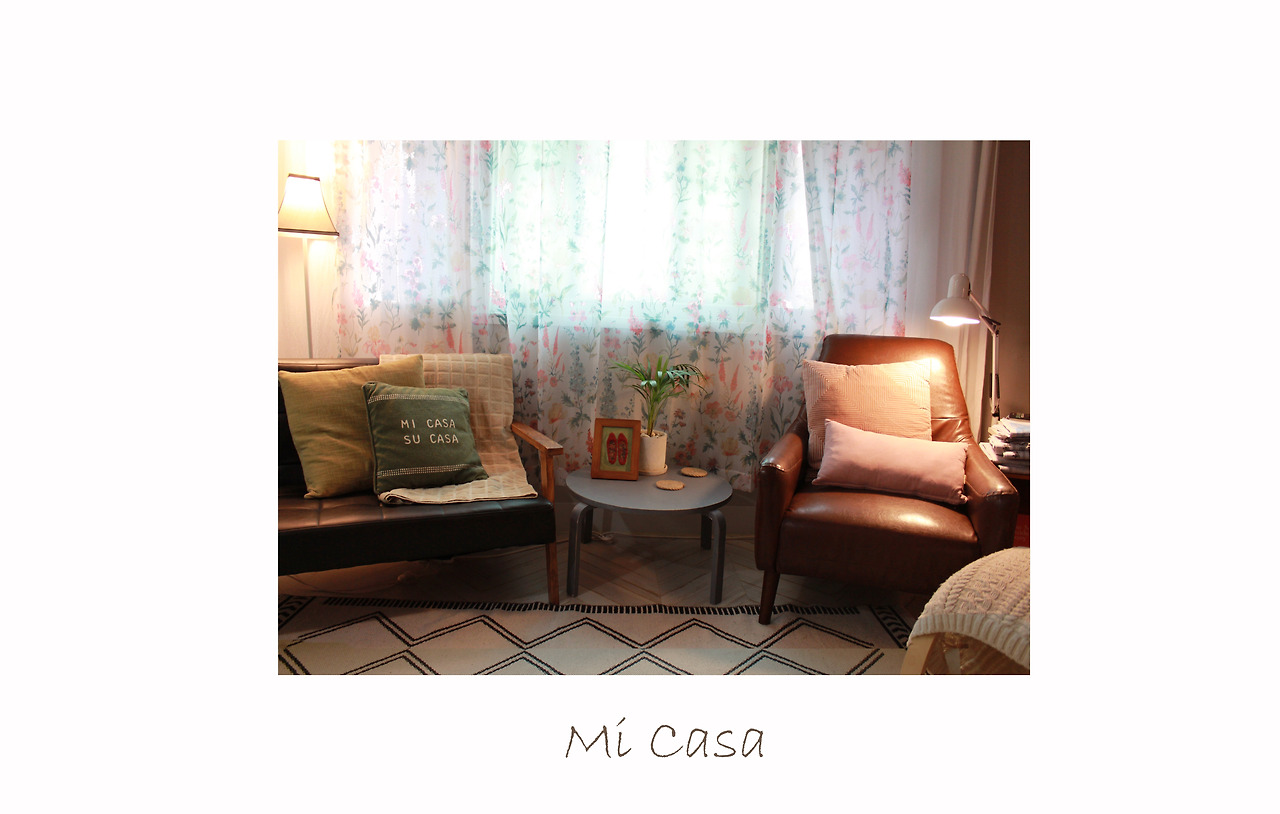매력적인 채도에 푸른색의 거친 질감을 가진 커튼과 잔잔한 꽃무늬가 있는 베이지색 커튼은 서로 만나면 참 잘 어울려요. 여기에 분홍의 빈티지 쿠션 커버. 그리고 커튼에 있는 꽃무늬보다 패턴이 크고 더 빈티지 푸른색의 또 다른 쿠션 커버. 그리고 쿠션 중에 가장 큰 쿠션은 푸른색. 빈티지 붉은색. 채도가 낮은 분홍색 베이지색이 담긴 레트로 한 스트라이프 무늬의 커버예요. 러그는 단순한 베이지 빛으로 앞의 패브릭들의 무늬를 돋보이게 하는 역할을 하죠.