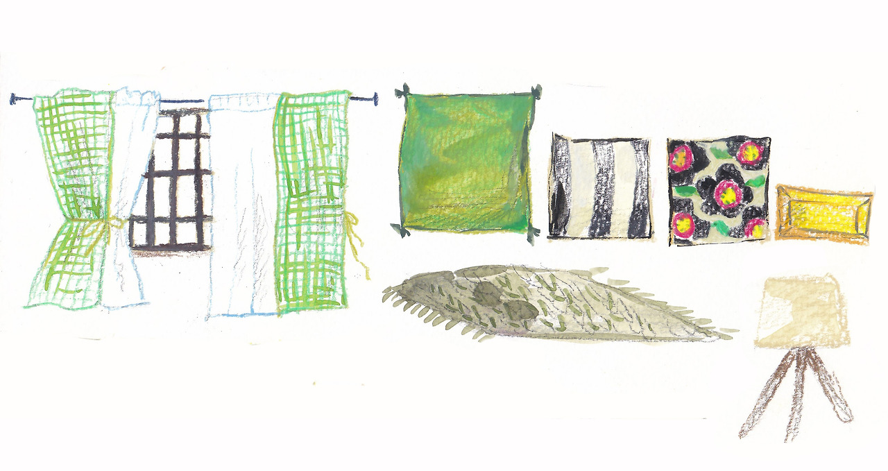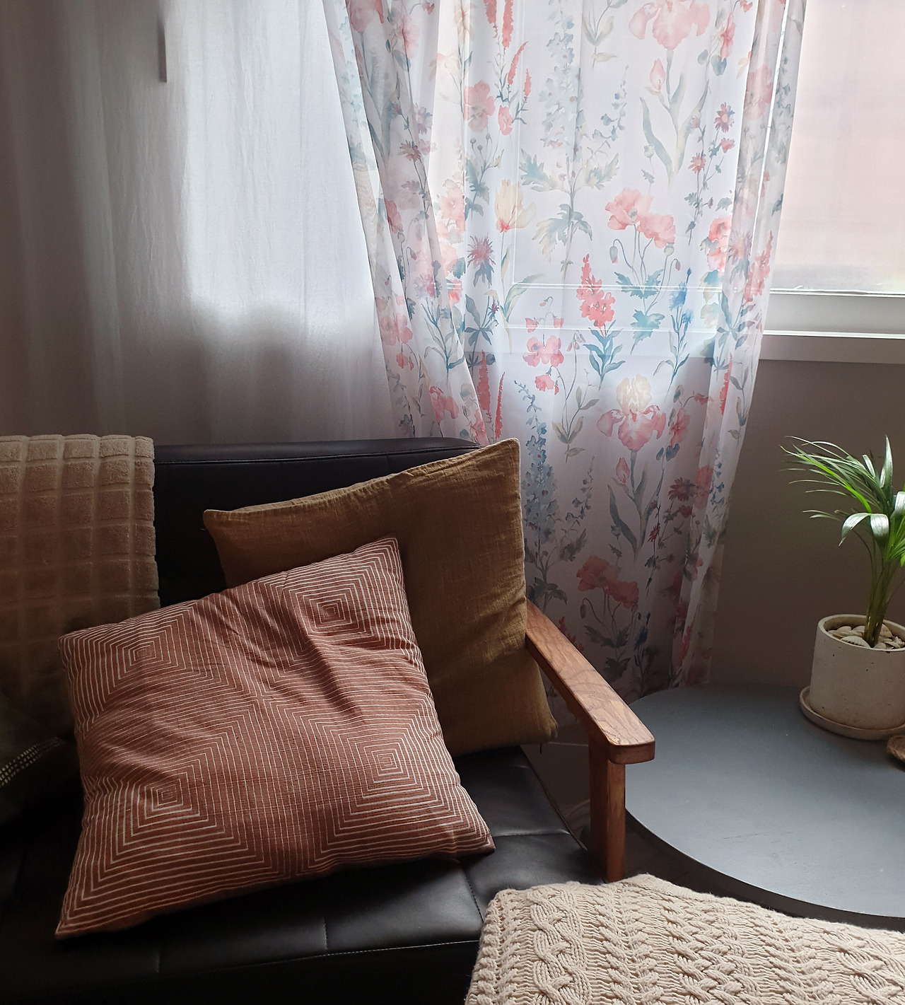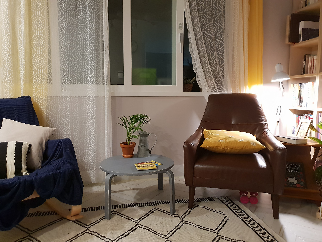 매력적인 채도에 푸른색의 거친 질감을 가진 커튼과 잔잔한 꽃무늬가 있는 베이지색 커튼은 서로 만나면 참 잘 어울려요. 여기에 분홍의 빈티지 쿠션 커버. 그리고 커튼에 있는 꽃무늬보다 패턴이 크고 더 빈티지 푸른색의 또 다른 쿠션 커버. 그리고 쿠션 중에 가장 큰 쿠션은 푸른색. 빈티지 붉은색. 채도가 낮은 분홍색 베이지색이 담긴 레트로 한 스트라이프 무늬의 커버예요. 러그는 단순한 베이지 빛으로 앞의 패브릭들의 무늬를 돋보이게 하는 역할을 하죠.