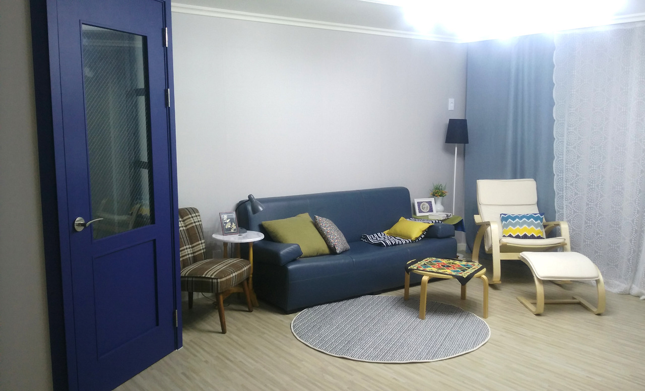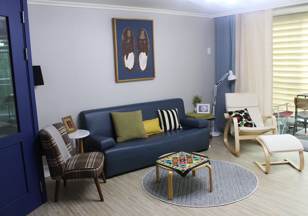 남색과 푸른색, 회색, 노랑의 색이 있는 거실