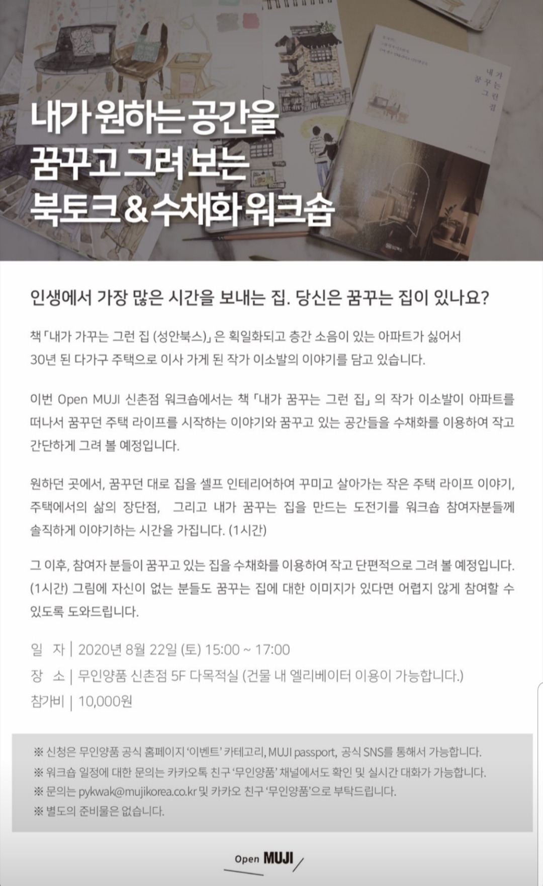 Open MUJI 「내가 원하는 공간을 꿈꾸고 그려보는 북토크&수채화」워크숍 인생에서 가장 많은 시간을 보내는 집, 당신은 꿈꾸는 집이 있나요? 책 “내가 꿈꾸는 그런 집”(성안북스)은 획일화되고 층간 소음이 있는 아파트가 싫어서 떠나 30년 된 주택(다가구)으로 이사