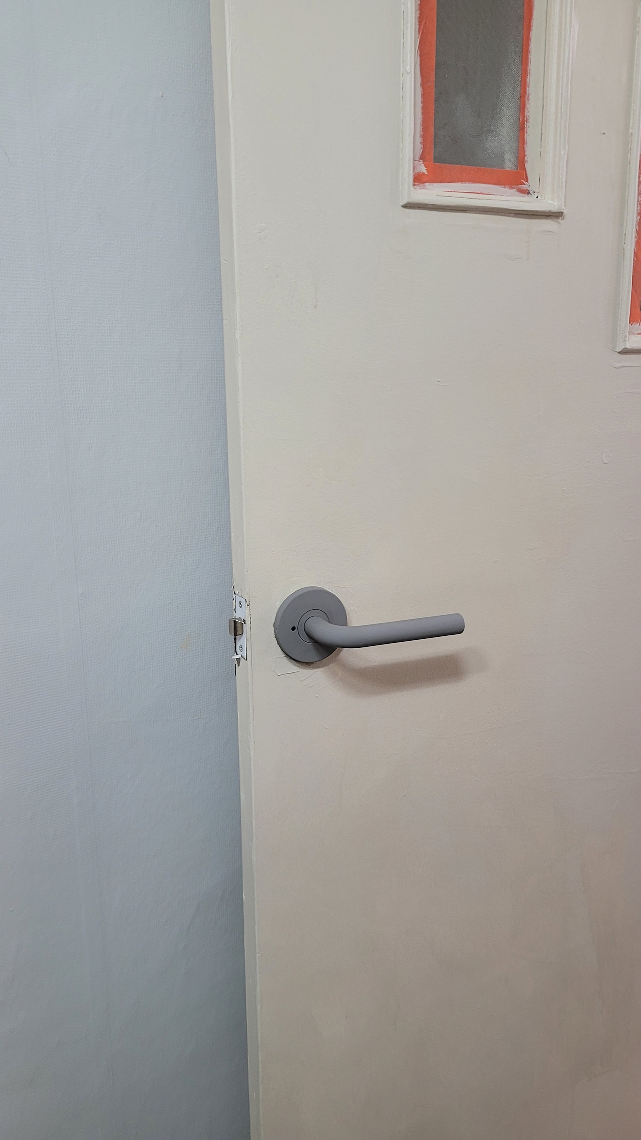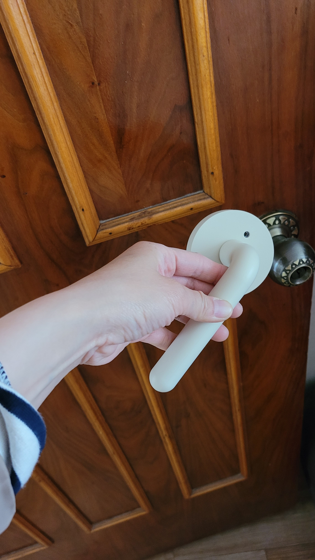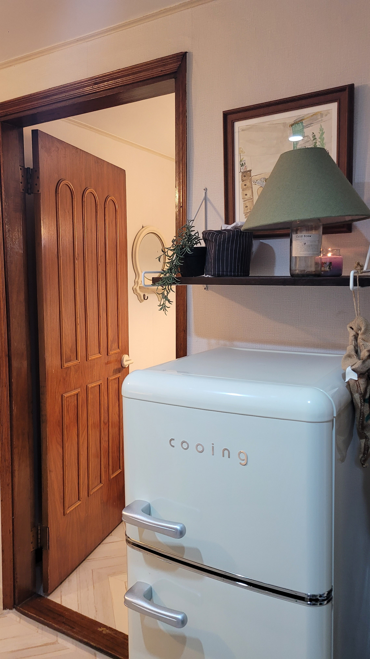 나무 문을 남겨두는 대신, 문고리 색과 맞추어서 다른 걸레받이 몰딩색을 통일되어 집의 색을 어울리게 함.