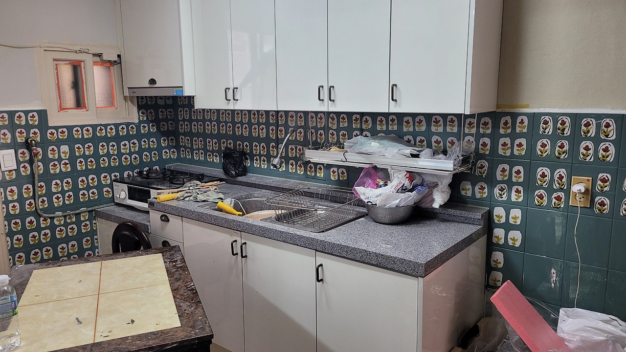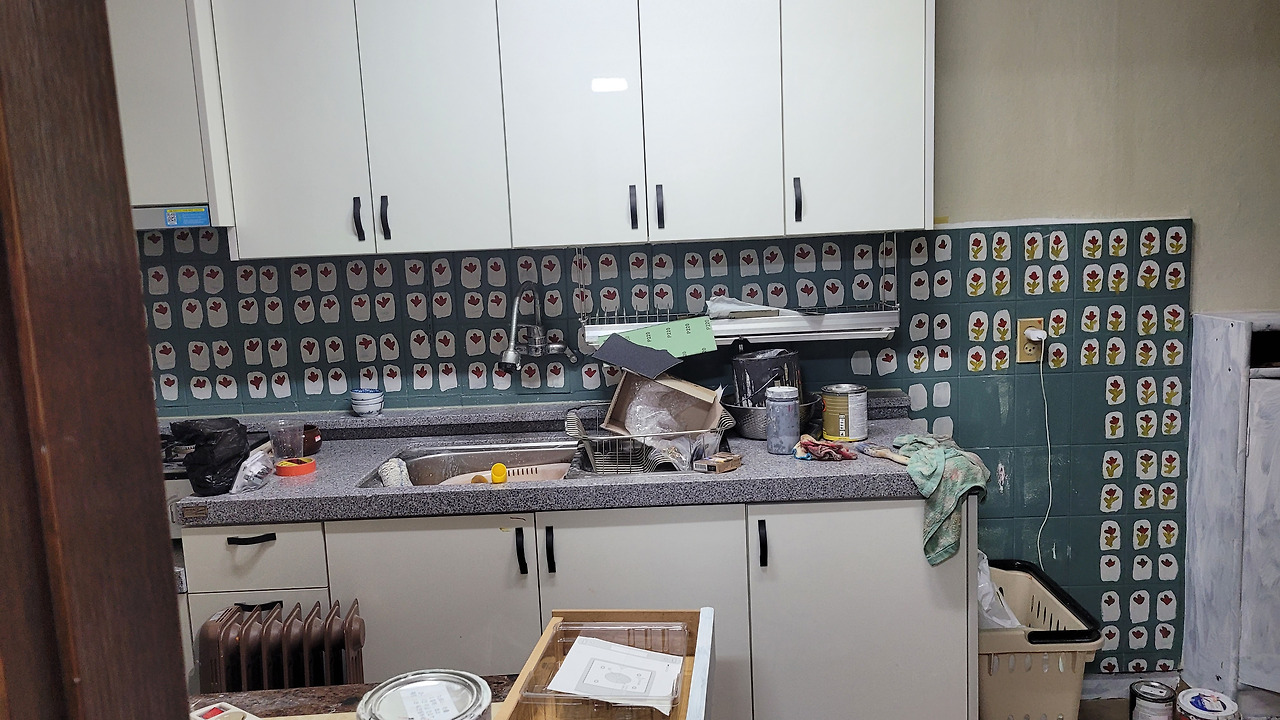 공사는 1. 부엌 타일에 그림 그리기 / 몰딩, 걸레받이 색칠