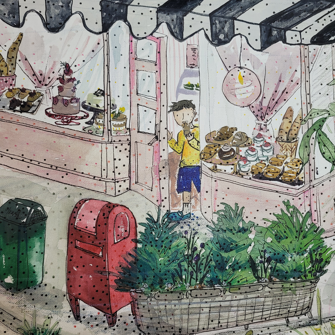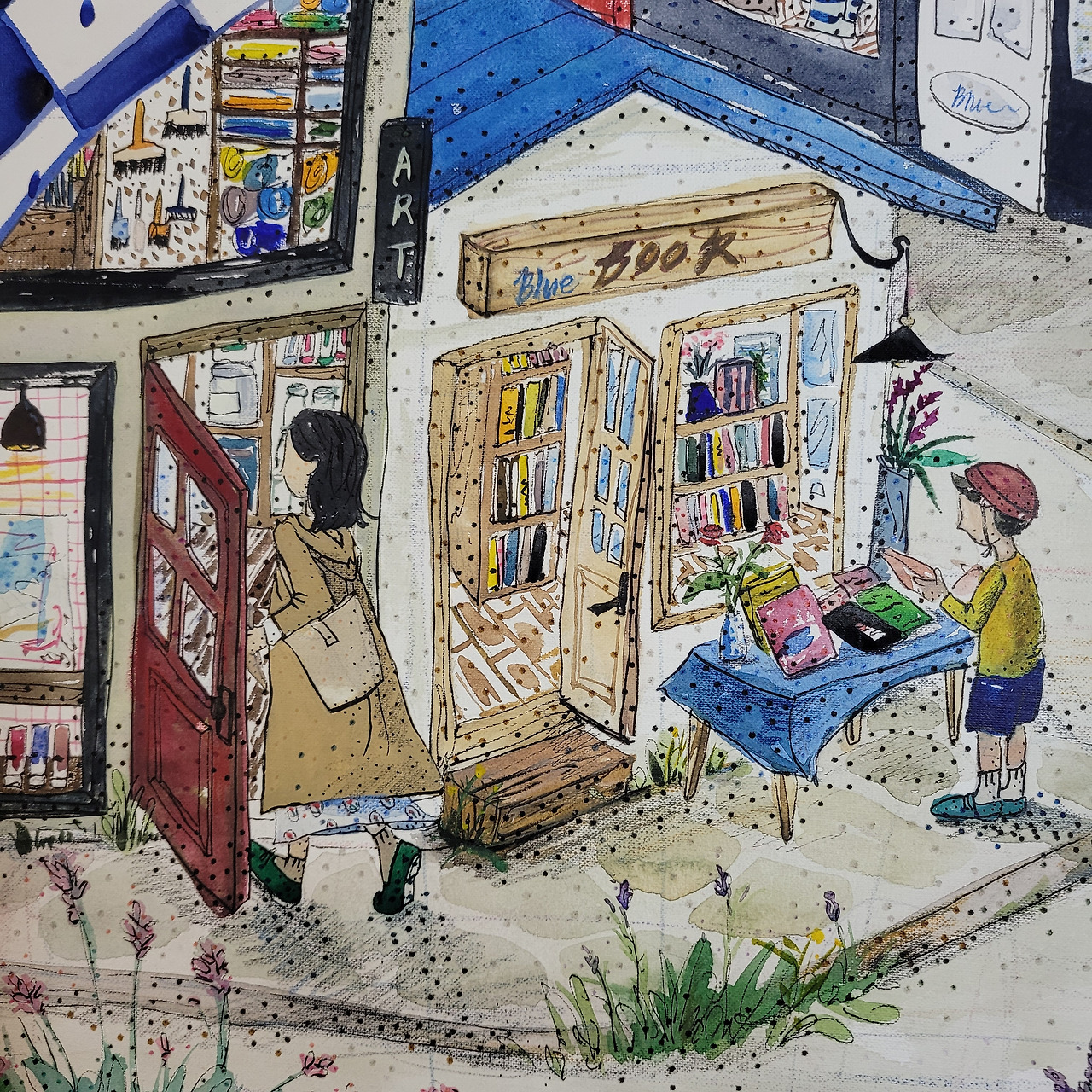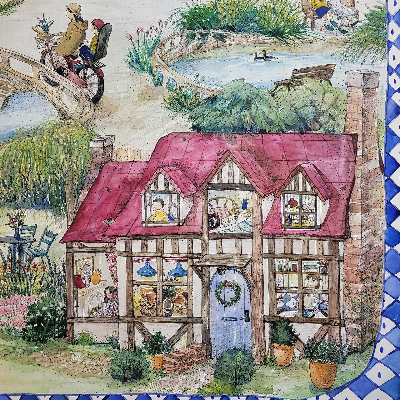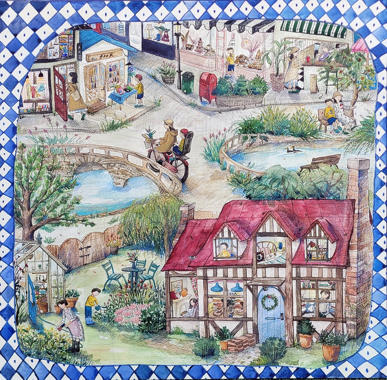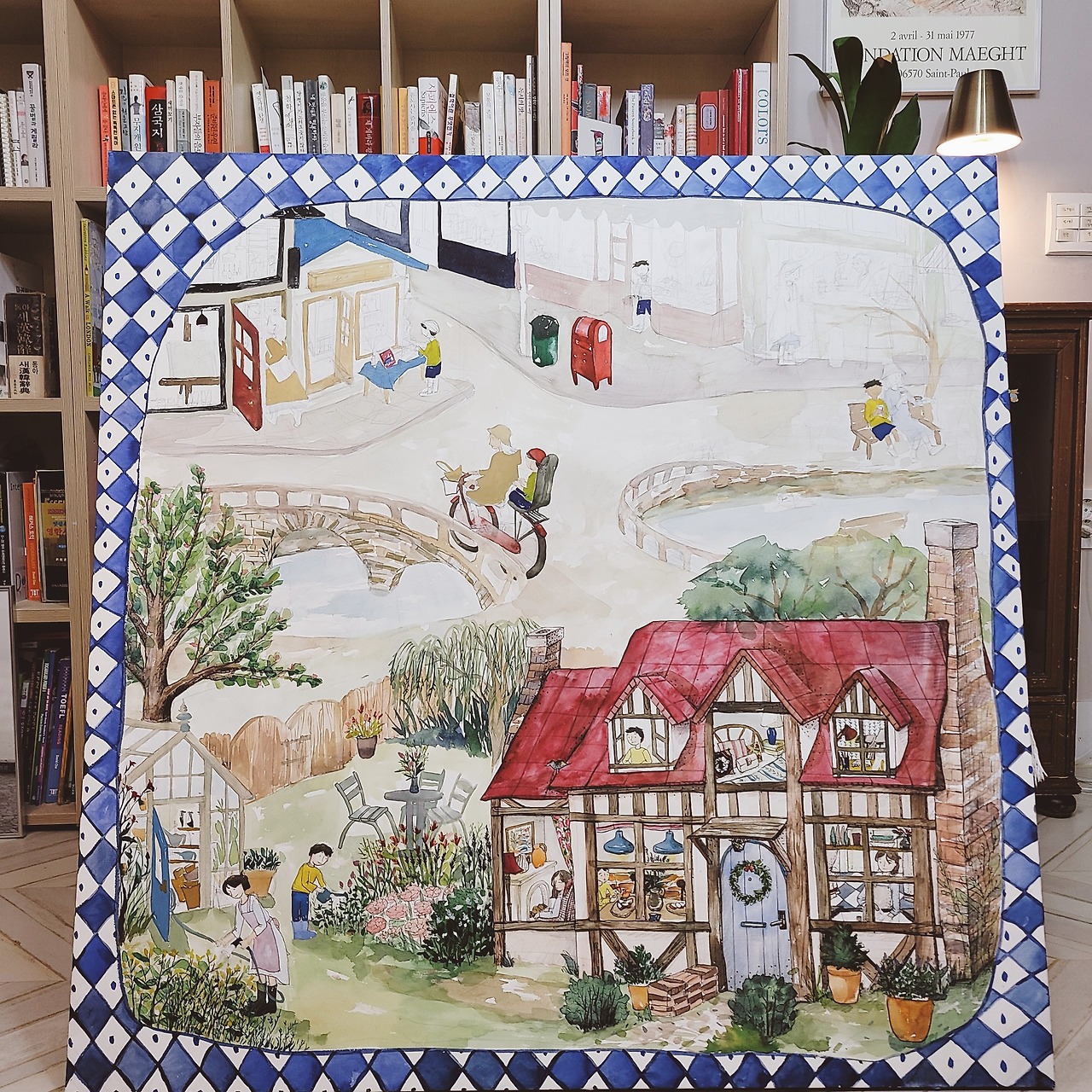 우연히 드로잉 한 패턴을 그림의 테투리에 넣고, 그 안에 뭉실뭉실 내가 살고 싶은 삶의 방향을 담았다. 아름다운 시간을 담은 접원의 집, 손질이 가능한 정도의 정원, 시원한 바람을 맞으며 달리는 자전거의 우리, 늘 동경하던 어느 나라의 작은 도시 그곳의 아름다운 숍들. 그곳에서의 우리. 그렇게 하나하나 그려가니 그림이 완성되어갔다.