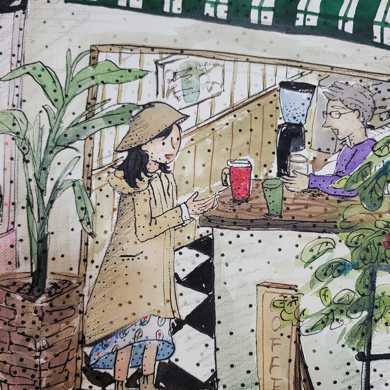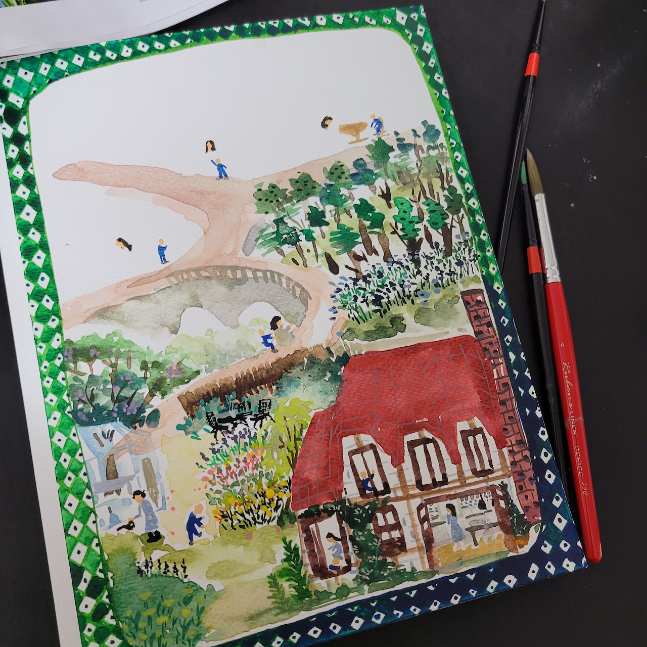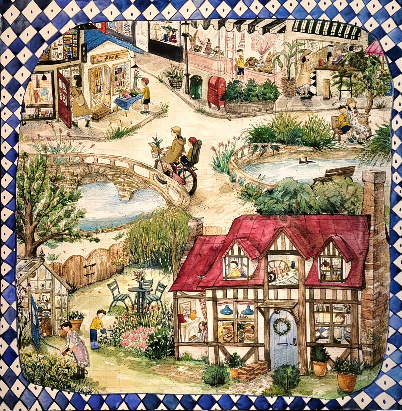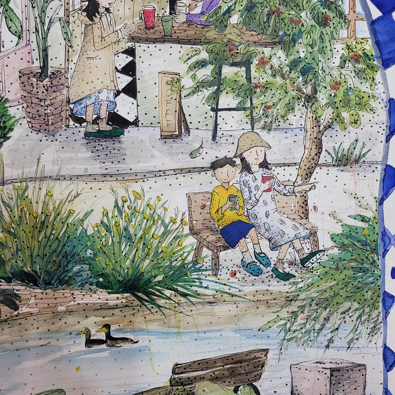우연히 드로잉 한 패턴을 그림의 테투리에 넣고, 그 안에 뭉실뭉실 내가 살고 싶은 삶의 방향을 담았다. 아름다운 시간을 담은 접원의 집, 손질이 가능한 정도의 정원, 시원한 바람을 맞으며 달리는 자전거의 우리, 늘 동경하던 어느 나라의 작은 도시 그곳의 아름다운 숍들. 그곳에서의 우리. 그렇게 하나하나 그려가니 그림이 완성되어갔다.