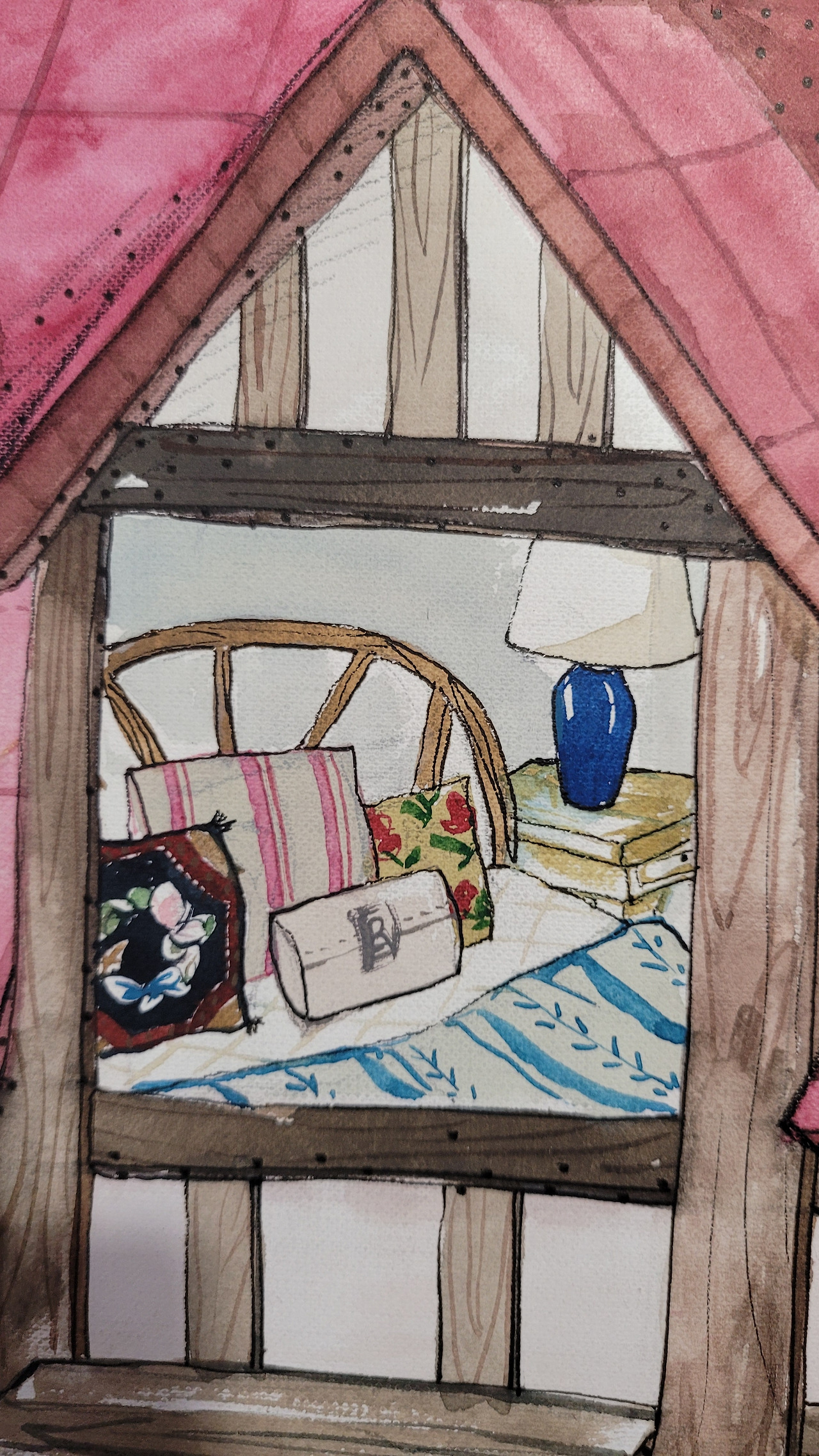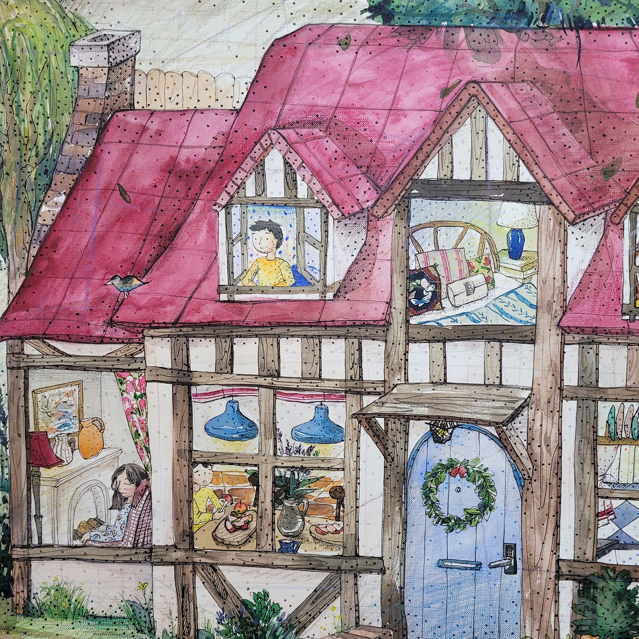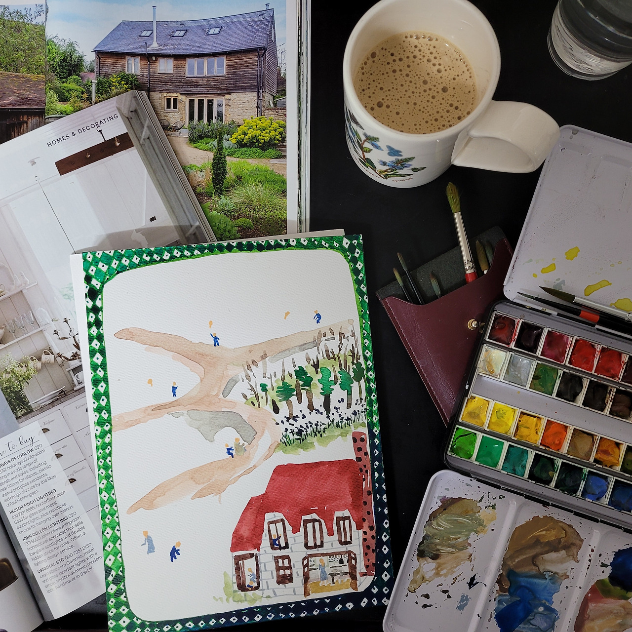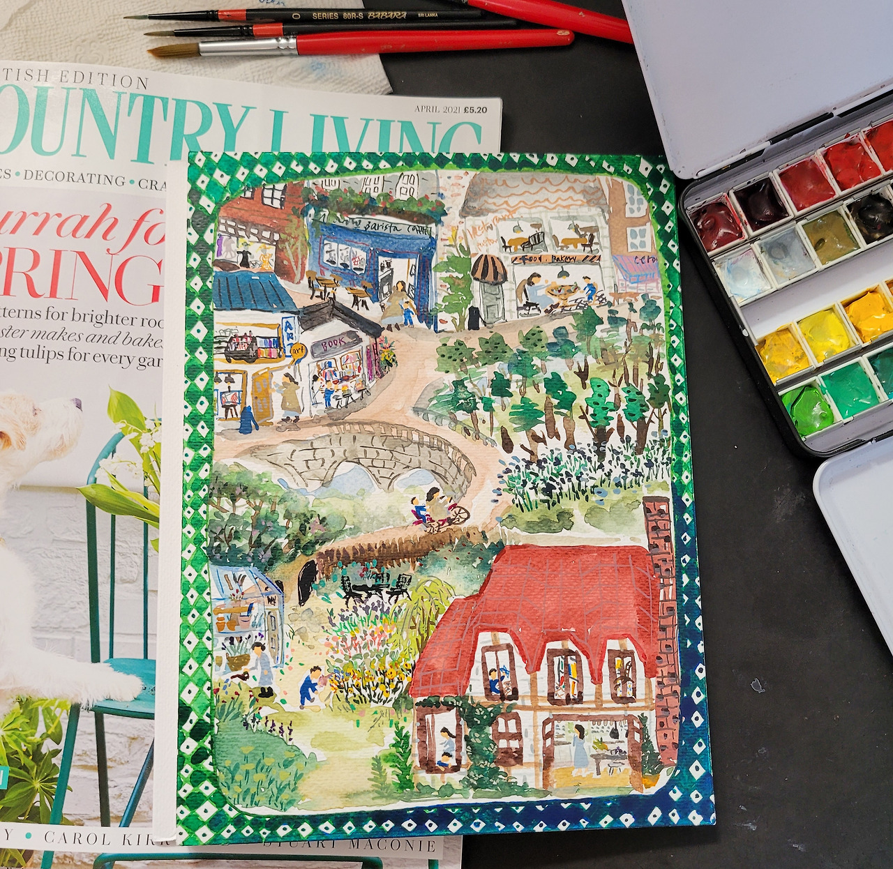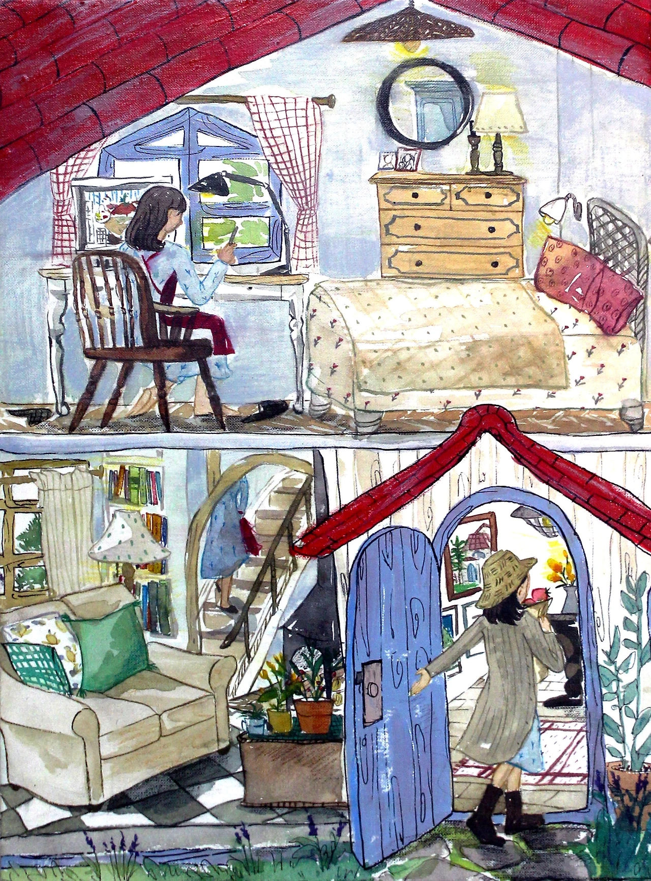 우연히 드로잉 한 패턴을 그림의 테투리에 넣고, 그 안에 뭉실뭉실 내가 살고 싶은 삶의 방향을 담았다. 아름다운 시간을 담은 접원의 집, 손질이 가능한 정도의 정원, 시원한 바람을 맞으며 달리는 자전거의 우리, 늘 동경하던 어느 나라의 작은 도시 그곳의 아름다운 숍들. 그곳에서의 우리. 그렇게 하나하나 그려가니 그림이 완성되어갔다.