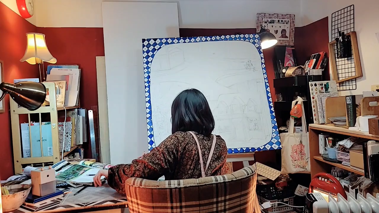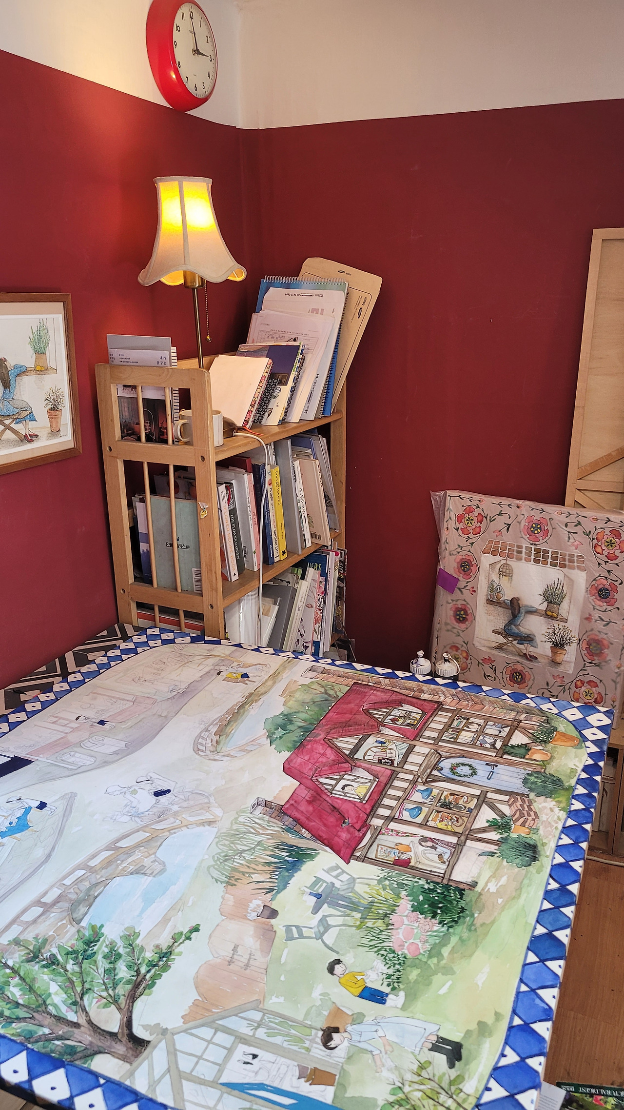 사진에 보이는 이 드로잉은 큰 그림의 에스 끼스로 설날에 어머님이 아이들을 봐주실 때 다락방에 들어가 그린 그림이다. 머리에만 담아두었던 아들과 나의 평화로운 일상의 모습들과 살고 싶은 미래의 집, 그리고 살고 싶은 작은 마을의 모습까지. 평번한 하루에 소소한 일상을 그렸다. 웃음 지어지는 그런.