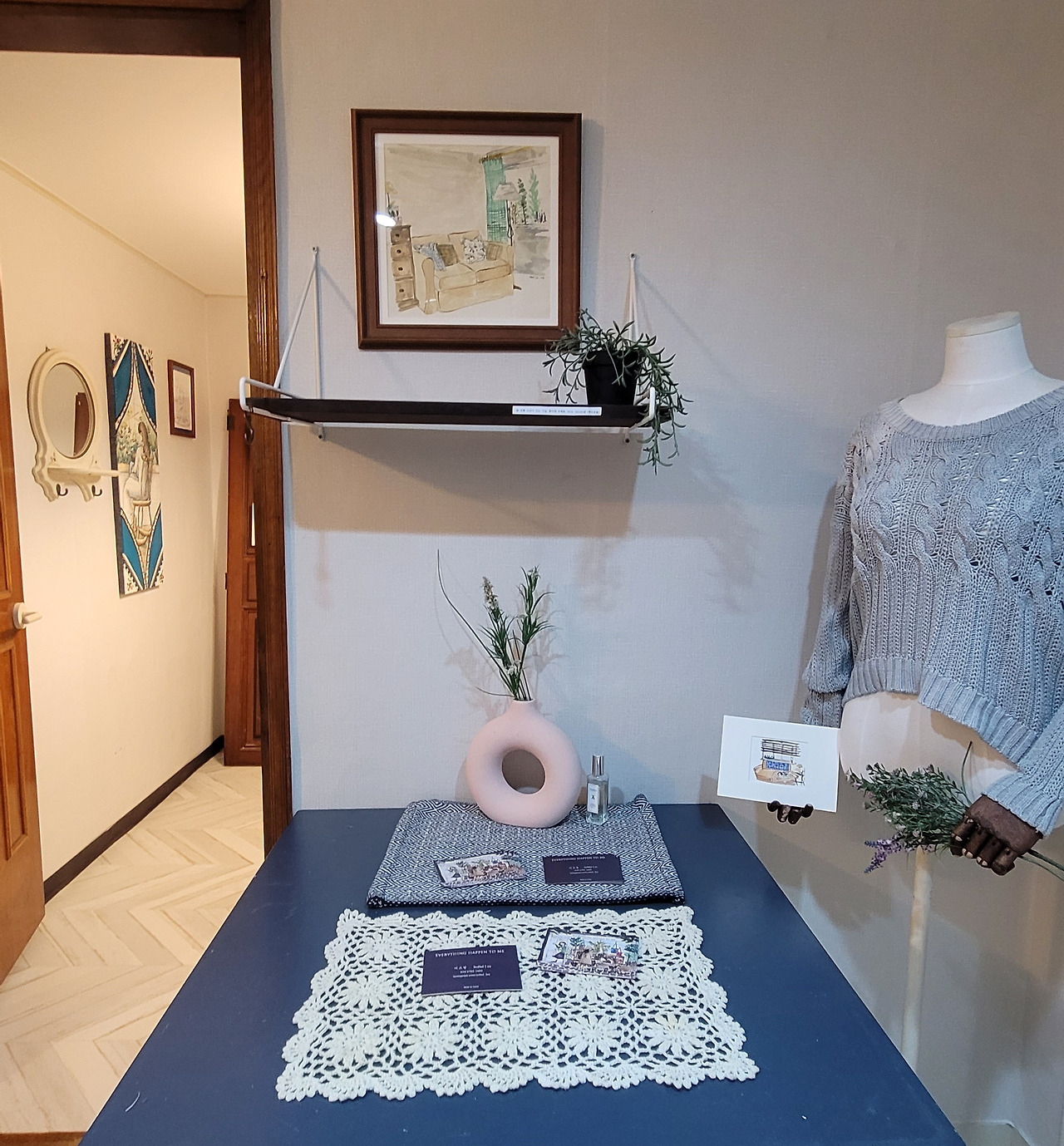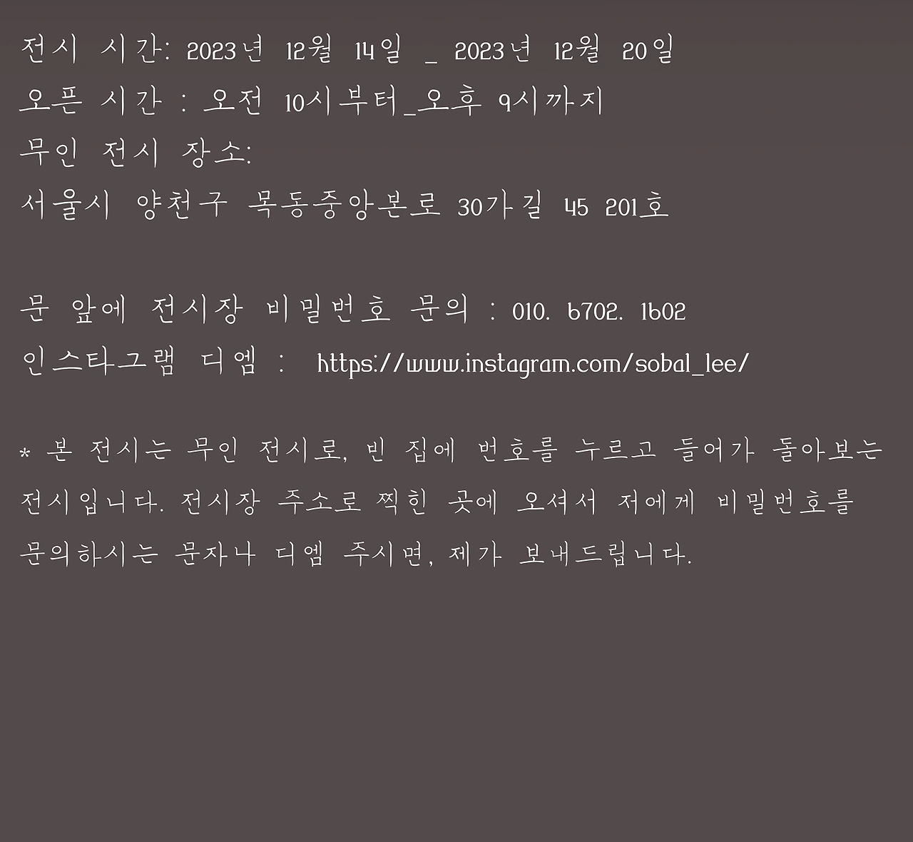 무인 전시라서 저녁까지 보실 수 있어요. 이쪽에 오실 일 있으시면 가벼운 마음으로 그림 보러 오세요:)