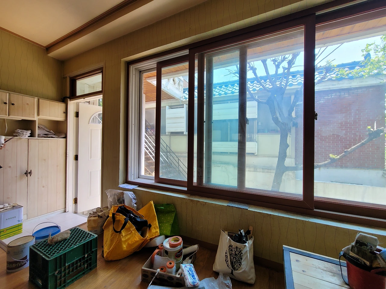 이 집은 집주인 분의 말대로, 체리색으로 집 문과 새시가 되어 있었는데 상태도 나쁘지 않았고, 이 체리색을 없애려고 한다면 새시의 체리색도 없애야 했기에.. 페인트든 시트지든 1번의 시공이 더 필요했다. 뭐.. 그러면 변화의 느낌이 많겠지만, 창이 많은 이 집에서 그 시공을 하기에는 불필요해 보였다. 왜냐하면 현재의 체리색 문의 상태가 다른 색으로 덮기에는 깨끗했고 창의 체리색도 나름 괜찮았다. '이걸 포인트로 두어보자..' 꼭 다 없애고 고치는 것이 아닌, 남길 건 남기고 새로운 것과 어울리게 시공하여 공간을 꾸밀 수도 있는 것 아닌가.