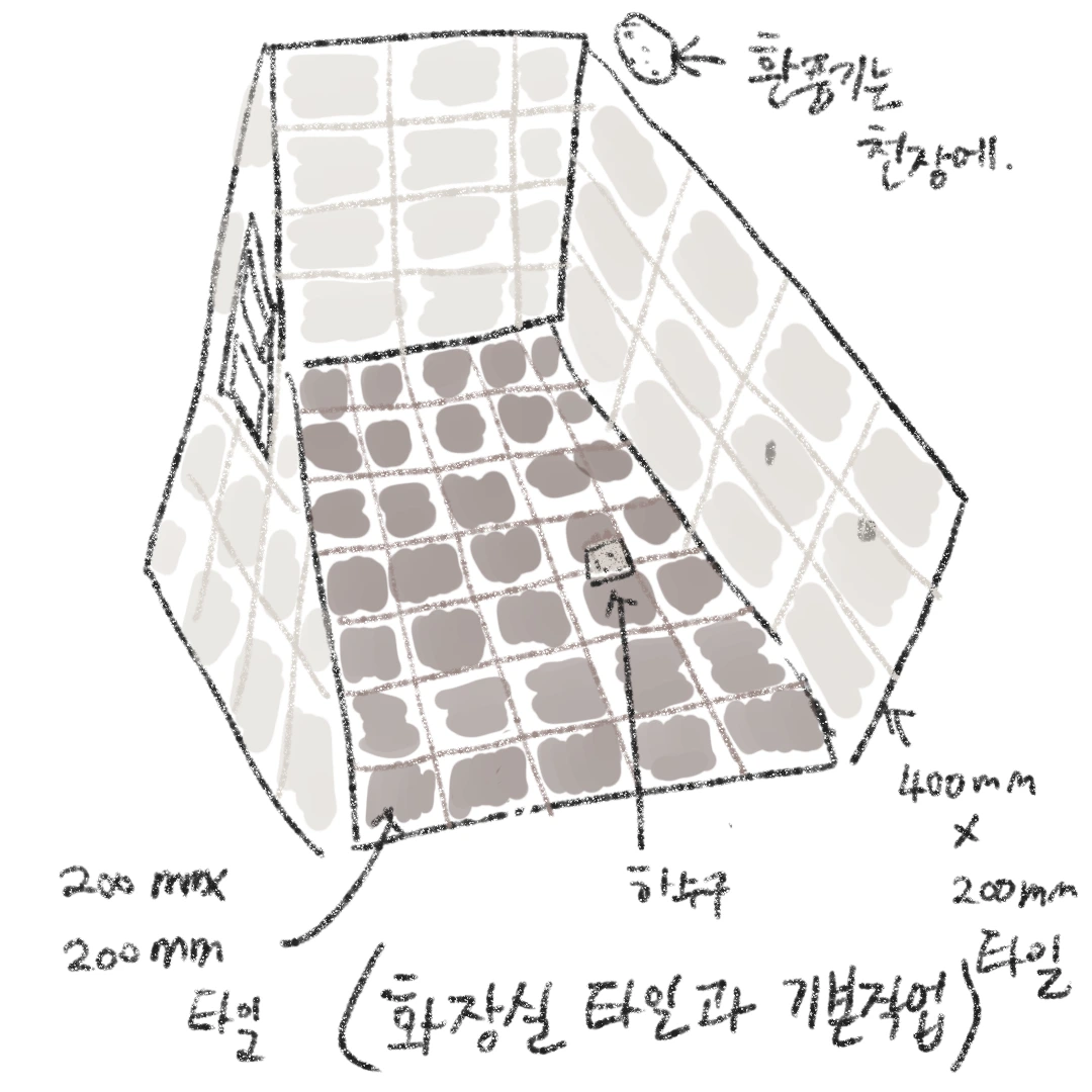 화장실은 일부러 화려한 타일이나 개성 있는 타일을 고르지 않고 아주 무난한 타일을 골랐다. 화장실 바닥타일 크기는 조금 더 크게 하고 싶었으나, 기존의 화장실 바닥이 고르지 않아서 그 특성상 작은 타일인 200mmx200mm을 골라서 붙였다. 때가 잘 타지않는 회색 줄눈으로 줄눈은 마무리했다.