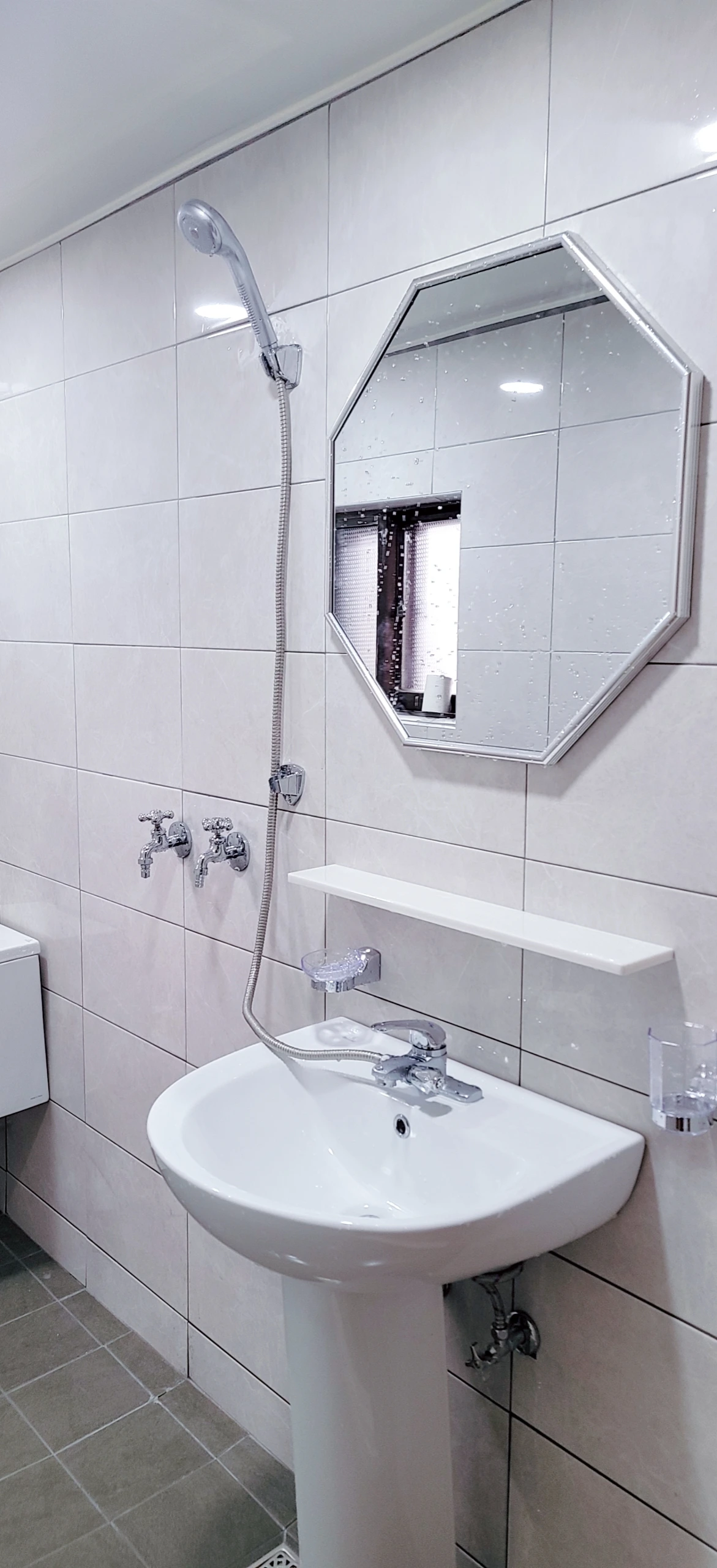 화장실 거울은 인터넷에 파는 거울 중에 적당한 거울을 골랐고, 세면대 위의 선반은 흰색과 미색이 섞인 작은 대리석 선반을 파는 곳이 있길래 찾아서 구매한 후에 화장실 시공 시 함께 달아달라고 했다.