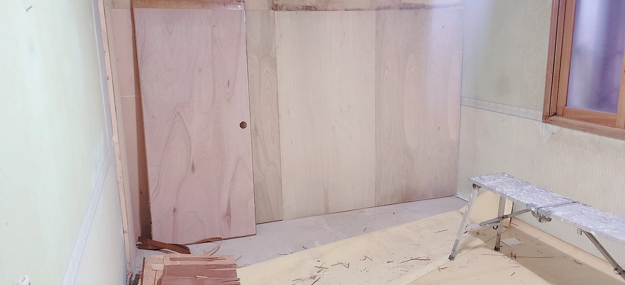 사진에 보면 문의 뒷면이 있는데 이 문은 물기에 썩은 화장실 문 뒤판을 갈아 둔 것이다. 목작업을 하는 김에 함께 화장실 문 뒤판도 합판을 떼고 새것으로 바꾸어 달았다.