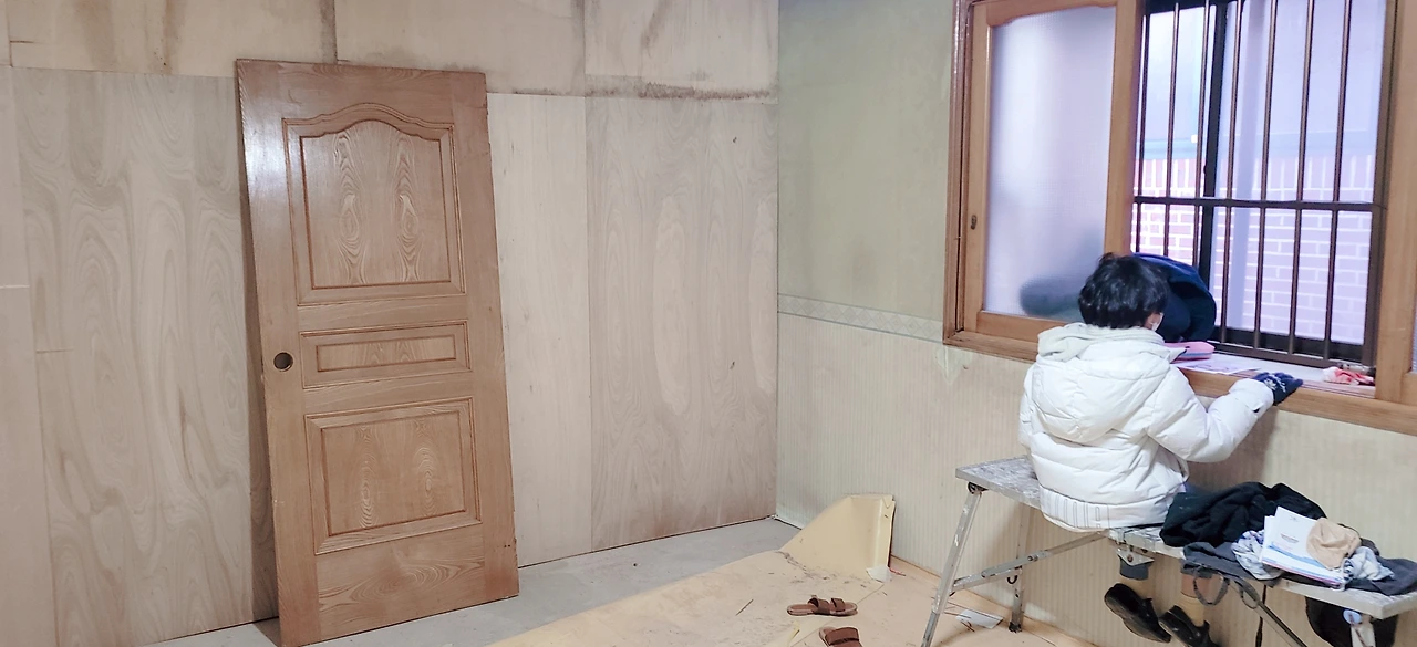 여기서 보면 화장실 문 뒷면이 너무 물에 삭아서 문 뒤판을 갈면서 문을 뗐는데 그 김에 방에 두고 편하게 칠습니다.
