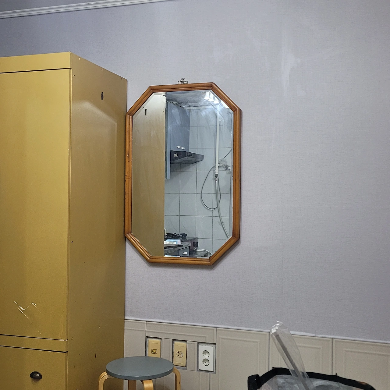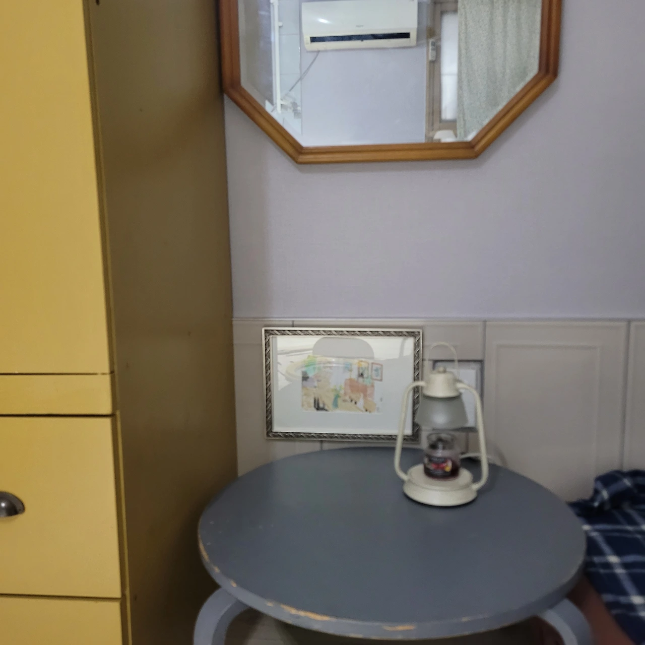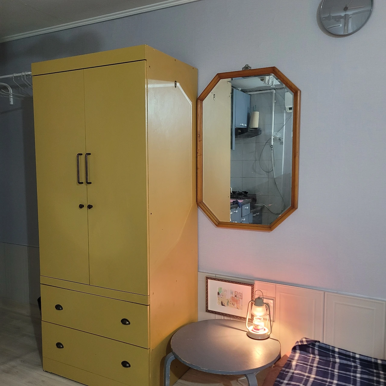 침대 아래쪽, 노란 옷장 옆에는 거울을 두어서 꾸밈의 공간을 만들었습니다.