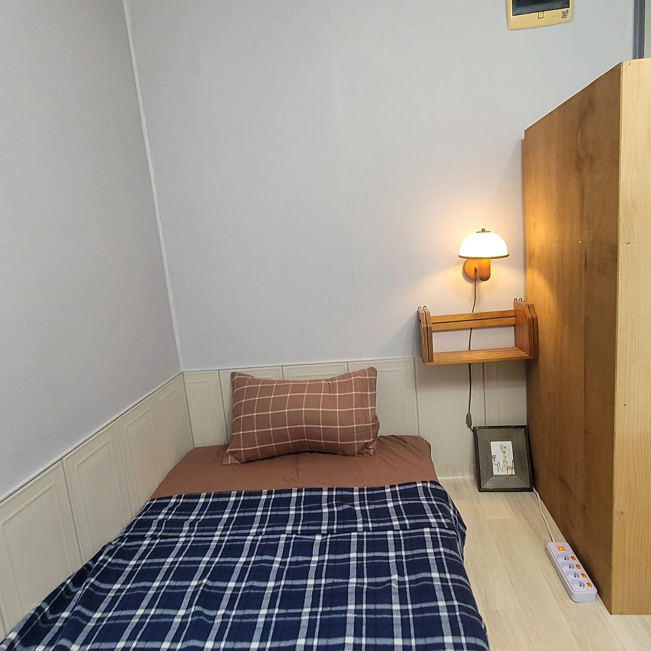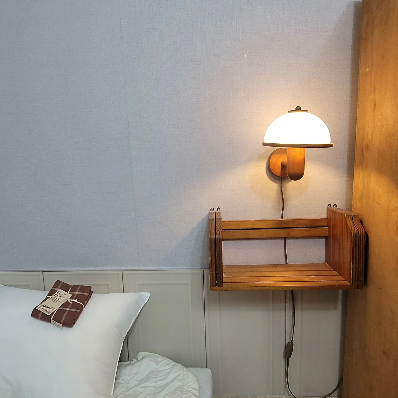 침대 옆에는 늘 필요한 거치대를 두었습니다. 애정하는 원목 벽 조명을 원목의 색을 같은 색으로 매치하였습니다. 이곳은 현관이 정말 좁은 원룸이었기에.. 현관 옆에 큰 책장을 두어 공간을 나누었습니다. 그리고 나누어진 공간에 침대를 아늑하게 둘 수 있었습니다.