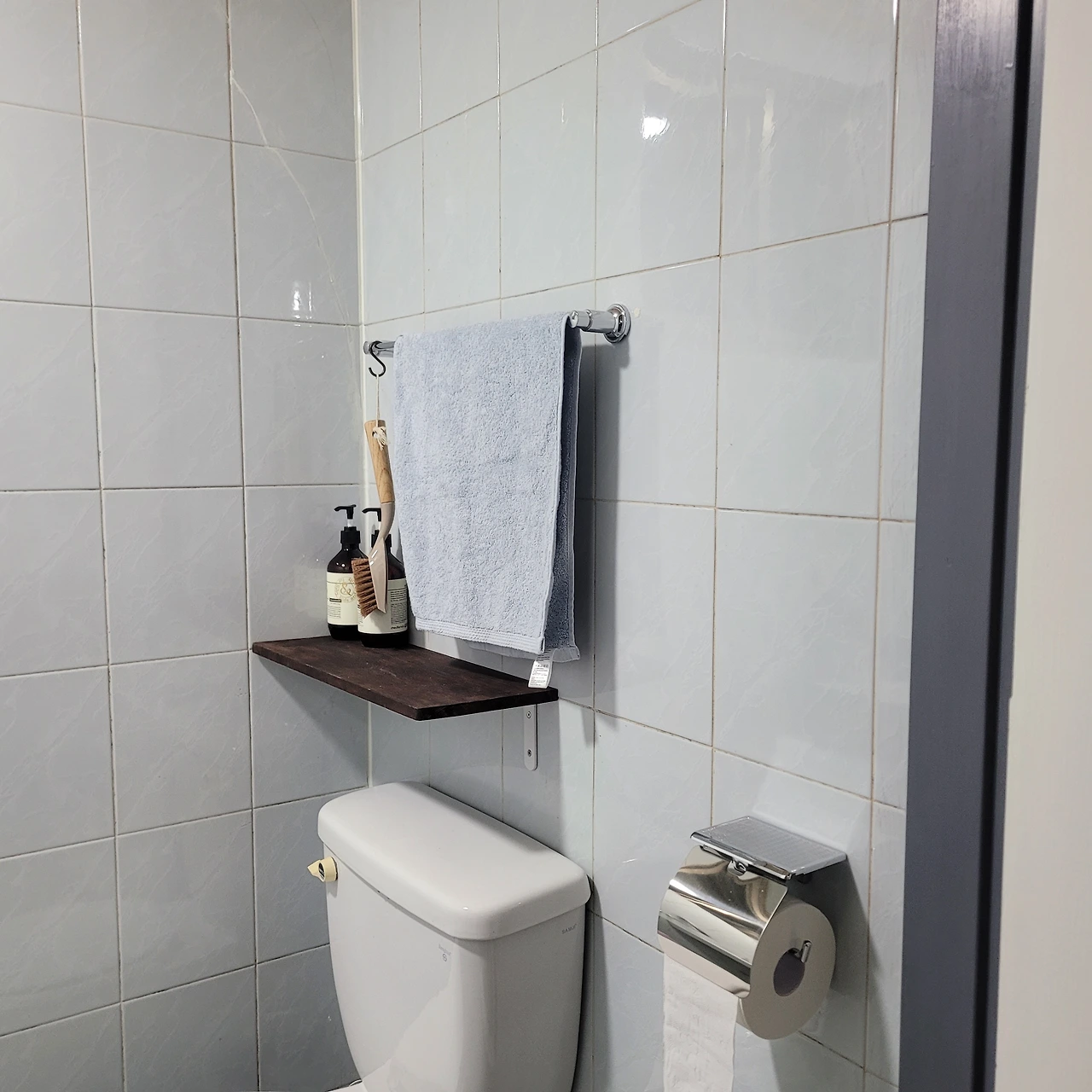 화장실에도 이렇게 선반을 달아서 왠지.. 더 신경 쓴 것 같은 공간을 완성했답니다. 세탁기에는 물이 닿으면 좋지 않을 듯 같아 커튼으로 분리를 해 두었지요.