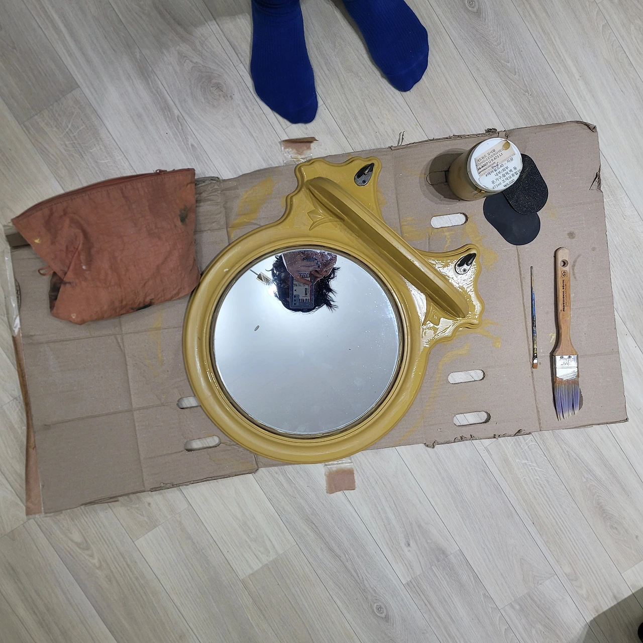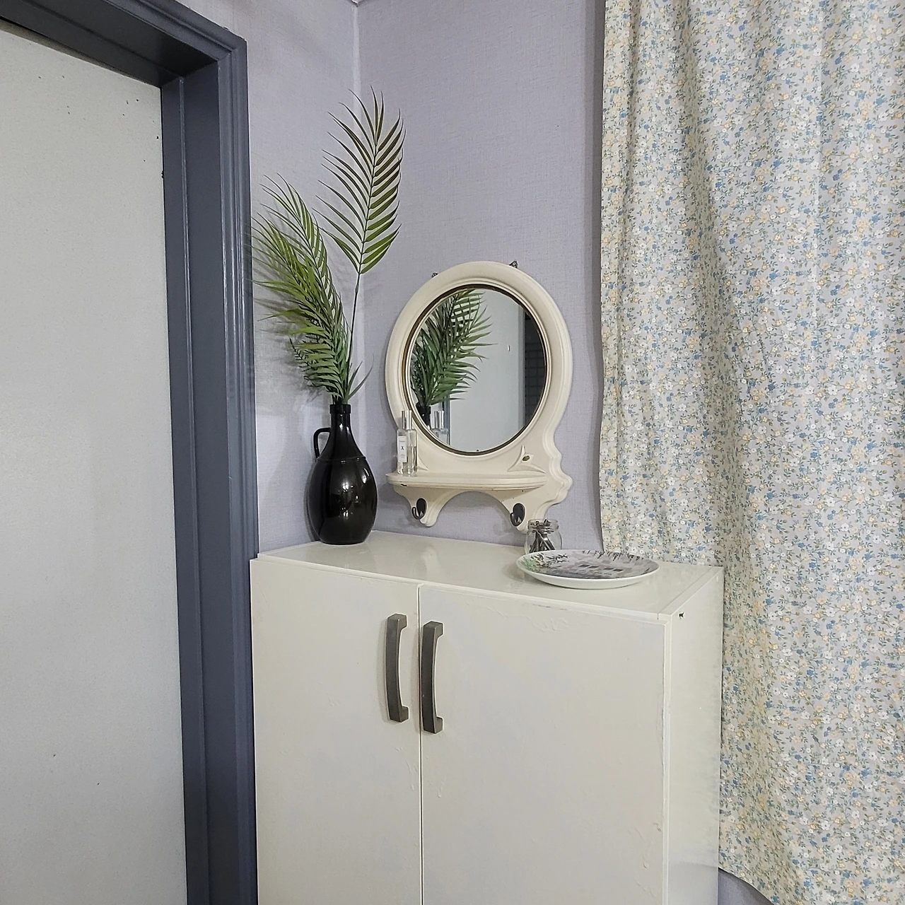 현관에는 예전 집에서 쓰였던 작은 소품용 거울을 두었는데.. 때도 탔고, 이 집과 색이 어울리지 않아서 옷장을 칠해준 노란색으로 거울을 칠해주어서 방 안에서 색이 어울리게 했습니다. 노란색으로 칠하니 옆의 꽃무늬 커튼과도 어울립니다.