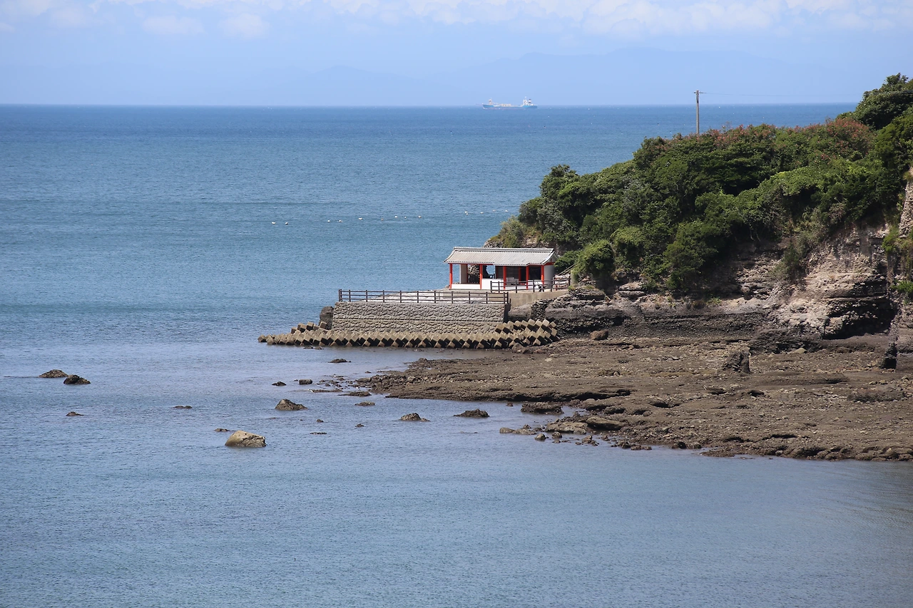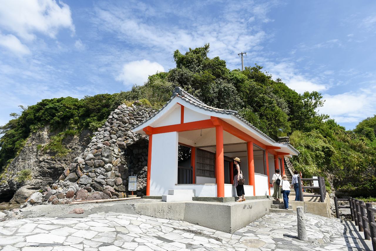 마타마 해안을 지나 고이카나 로드를 더 달리면 바다를 향해 나와 있는 아담한 신사가 보인다. 바다 쪽으로 튀어나온 암굴에 지어져 있는 신사는 일본에서도 보기 드문 신사다. 멀리서 바라본 신사는 바다와 어우러져 그림 같다. 차를 달려 신사가 있는 아와시마 공원으로 향한다.