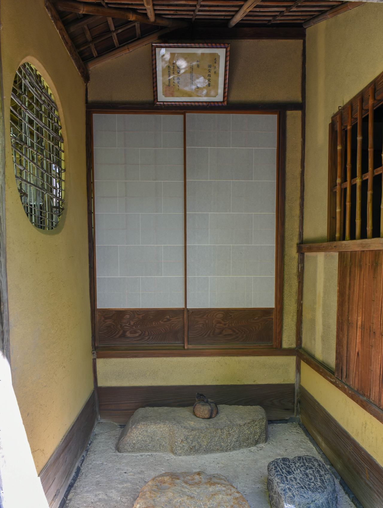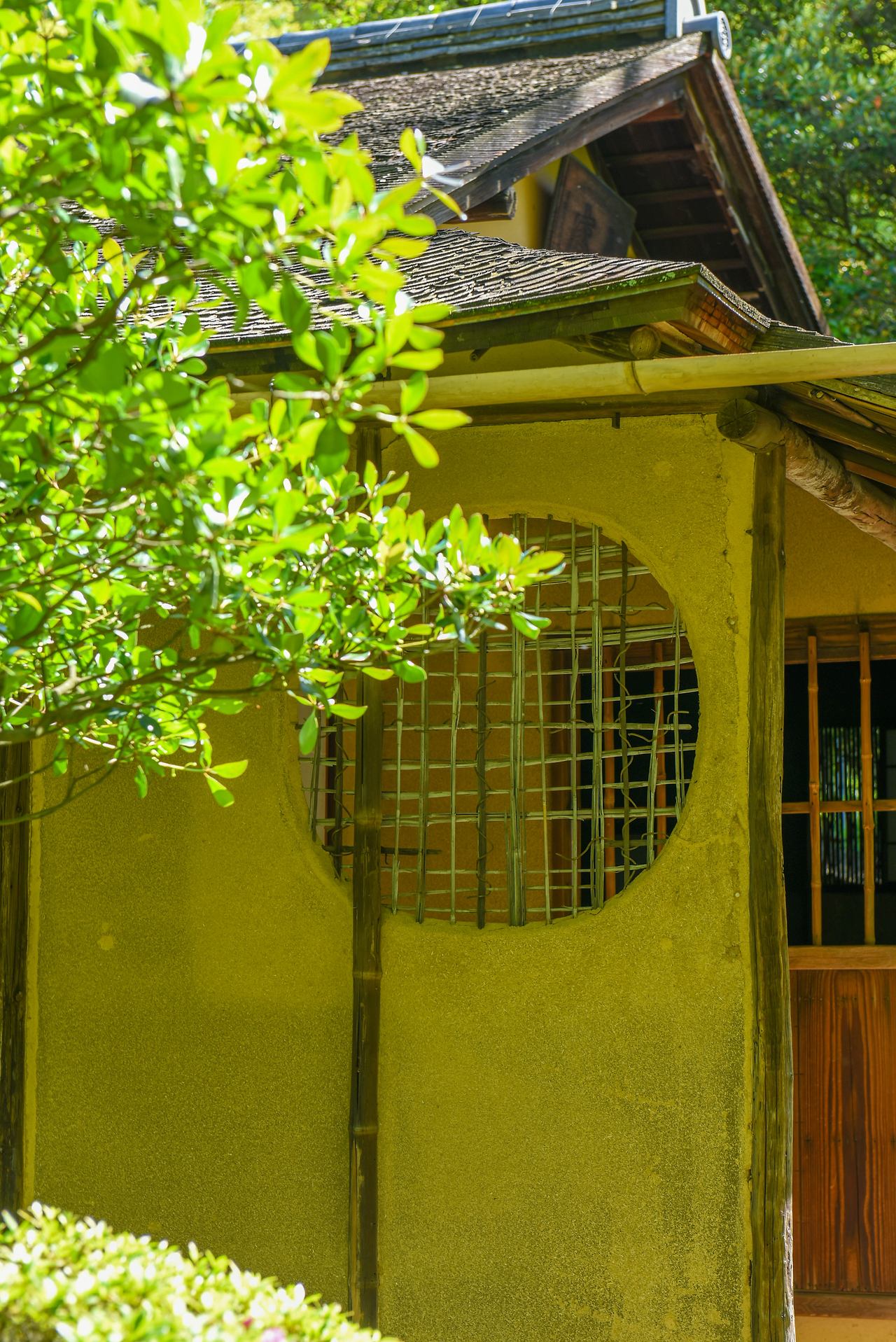 창문은 얇은 대나무 창살을 엮어 만들었는데, 햇살이 비추면 다실 바닥과 벽에 창살 무늬의 그림자가 드리운다. 다실을 미적으로도 완성시킨 오다 우라쿠의 감성이 보이는 대목이다. 다실 정면에 부산해라는 명패가 붙어 있는 돌 수반은 한국산이라고 하니 정겨운 느낌이 든다.