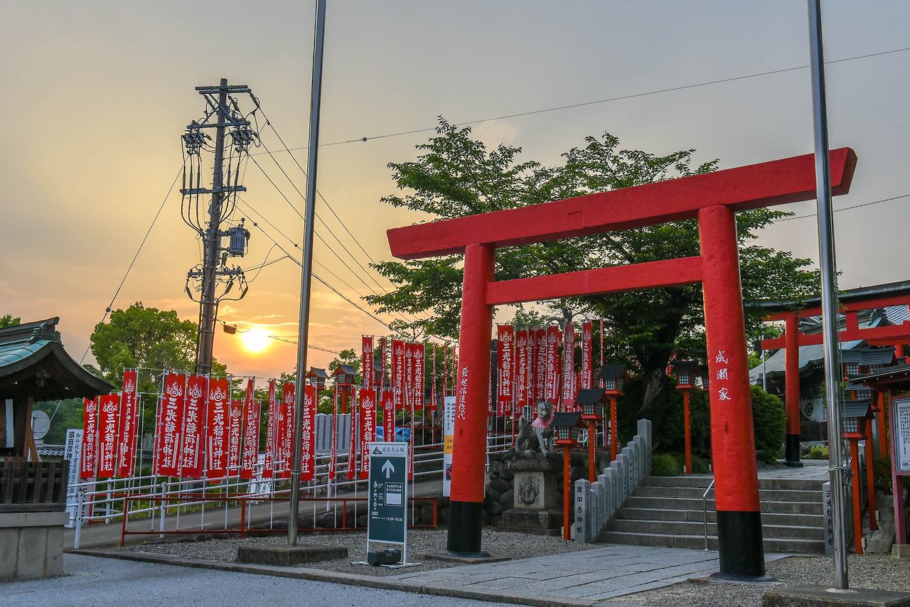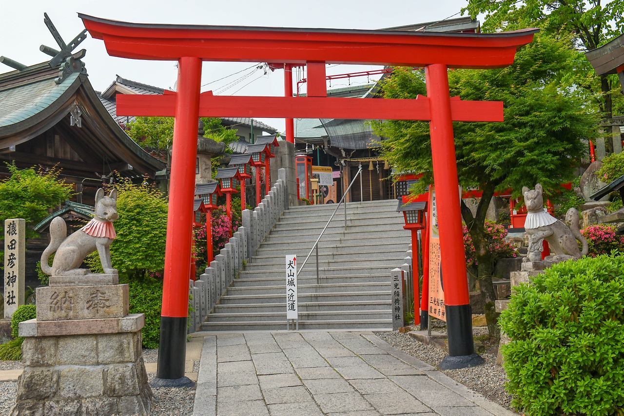 이누야마 성에 오르는 길에는 신사가 세 개가 있다. 성 가까이에 신사가 이렇게 많기도 드문 일이다. 그 중에서 빨간 도리이가 눈에 띄는 산코이나리 신사에 들렀다. 이나리, 여우가 문 앞을 지키는 신사는 이누야마 성주 오다 노부야스의 보호를 받고 있었다. 에도시대 이후 이누야마 성주 나루세의 수호신을 모신다. 토착 신앙과 불교신앙이 결속하여 하나의 신앙이 되는 신불습합(神仏習合)으로 삼광사(三光寺)라고 불렀으나, 1868년 메이지유신의 신불분리 정책으로 산코이나리 신사로 이름을 바꾸었다.