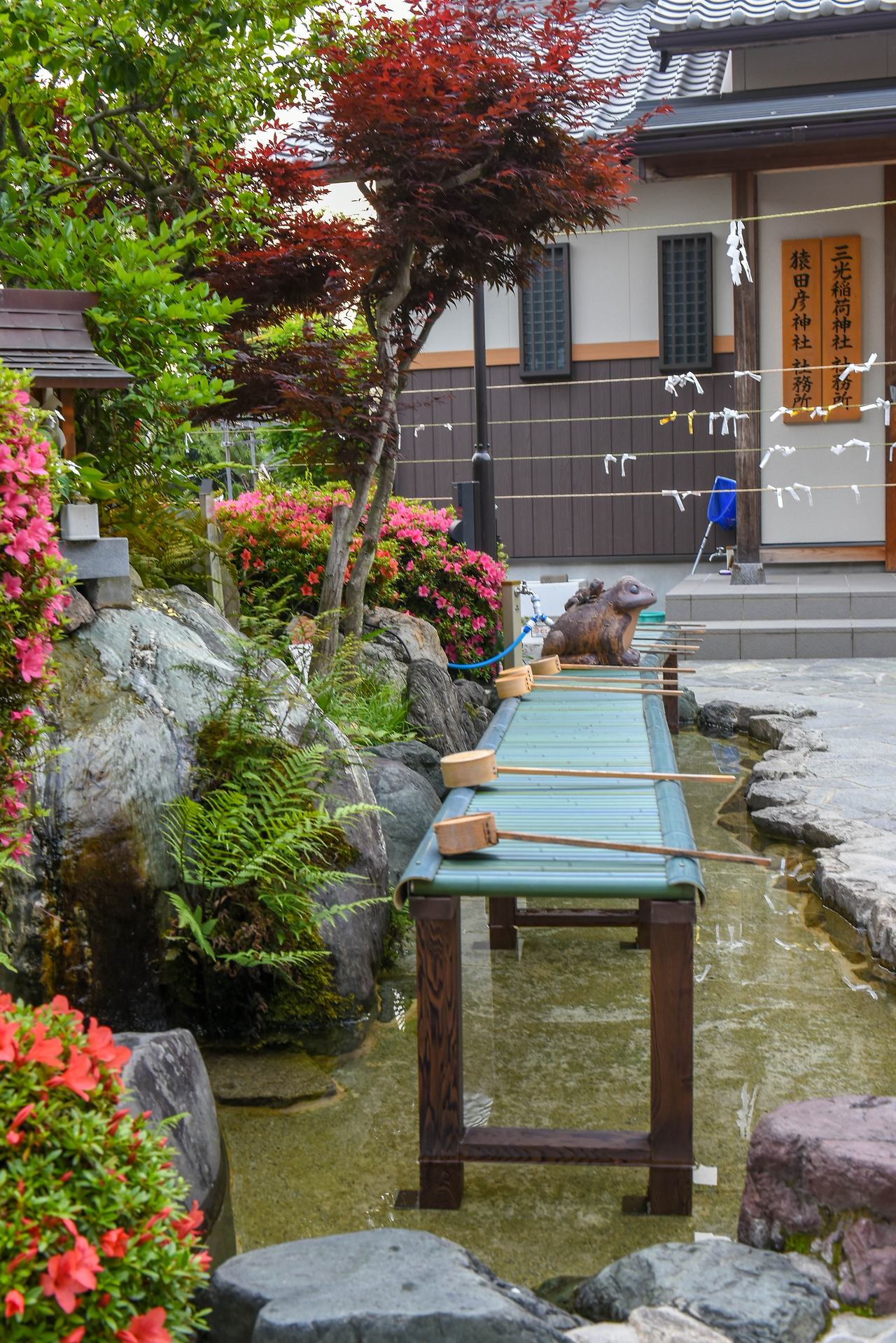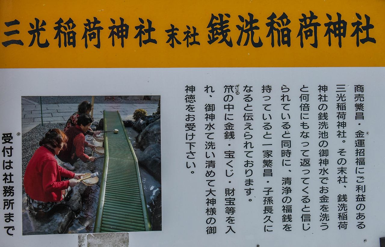 신사 안에는 또 다른 재미있는 풍경이 있다. 신사의 물로 돈을 씻으면 재물이 불어난다는 재니아라이가 그것인데, 대나무가 촘촘하게 연결된 판 아래로 물이 흐른다. 그 앞에서 바구니에 동전을 넣고 물을 떠서 돈 위에 부으면 재물이 불어난다고 한다.