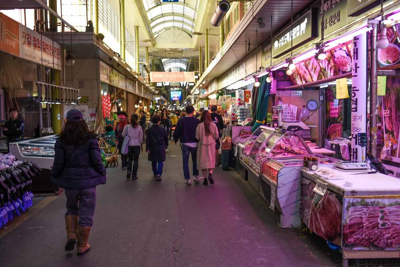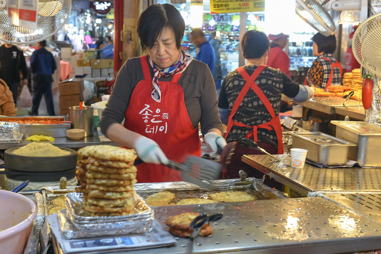 전통시장에서 빼놓을 수 없는 것은 먹거리다. 광장시장 먹거리가 많기로 소문났다. 시장에는 늘 고소한 냄새가 풍긴다. 40년이 넘은 육회 골목은 문 앞에서 대기표를 받아 들고 줄을 선 사람들로 붐빈다. 냄비가 넘치도록 재료가 담긴 시원한 대구 매운탕, 겨자소스를 찍어 먹는 마약김밥, 채소가 푸짐하게 들어간 비빔밥, 비 오는 날이면 더 좋은 도톰한 빈대떡은 광장시장의 명물이다.