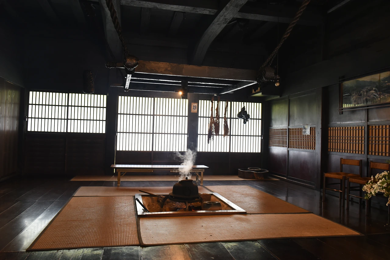 차(茶)를 무료로 마시고 가라는 팻말이 붙은 가옥에 들어서니 거실 한가운데 커다란 화롯가가 마련되어 있다. ‘이로리’라고 하는 일본 전통 난방장치다. 방바닥의 일부를 네모나게 잘라내고 그 안에 재를 깔아 불을 피운다. 화롯가에 줄을 매달아 물고기 상과 검게 그을린 주전자를 걸어 놓은 모습이 운치 있다. 이로리 위에 물고기 장식물을 매달아 놓은 것은 물에 사는 물고기가 화재를 막아준다는 의미라고 한다.