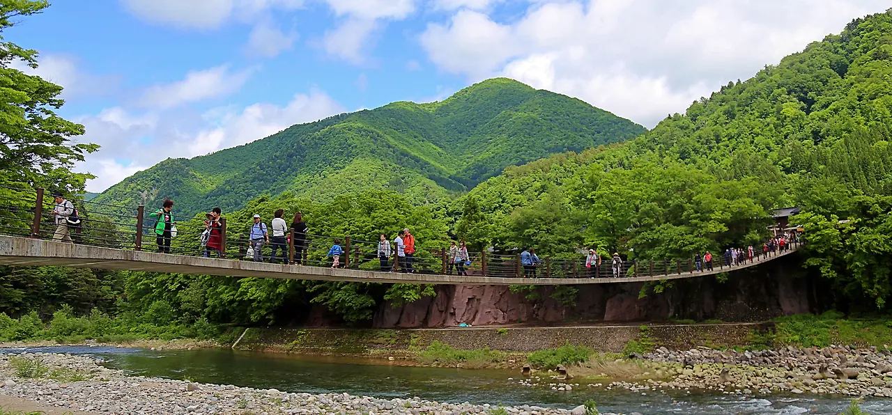 마을을 둘러보고 전통가옥 박물관, 갓쇼즈쿠리 민가엔에 가기로 했다. 마을에서 박물관에 가려면 마을 앞에 흐르는 쇼가와를 가로지르는 데아이바시를 건너야 한다. 데아이바시는 ‘만남의 다리’라는 뜻이다. 돌다리인데도 앞서가는 사람이 발걸음에 힘을 주면 다리가 약간 흔들리는 것 같다. 마을을 잇는 다리 자체도 하나의 풍경이 된다.
