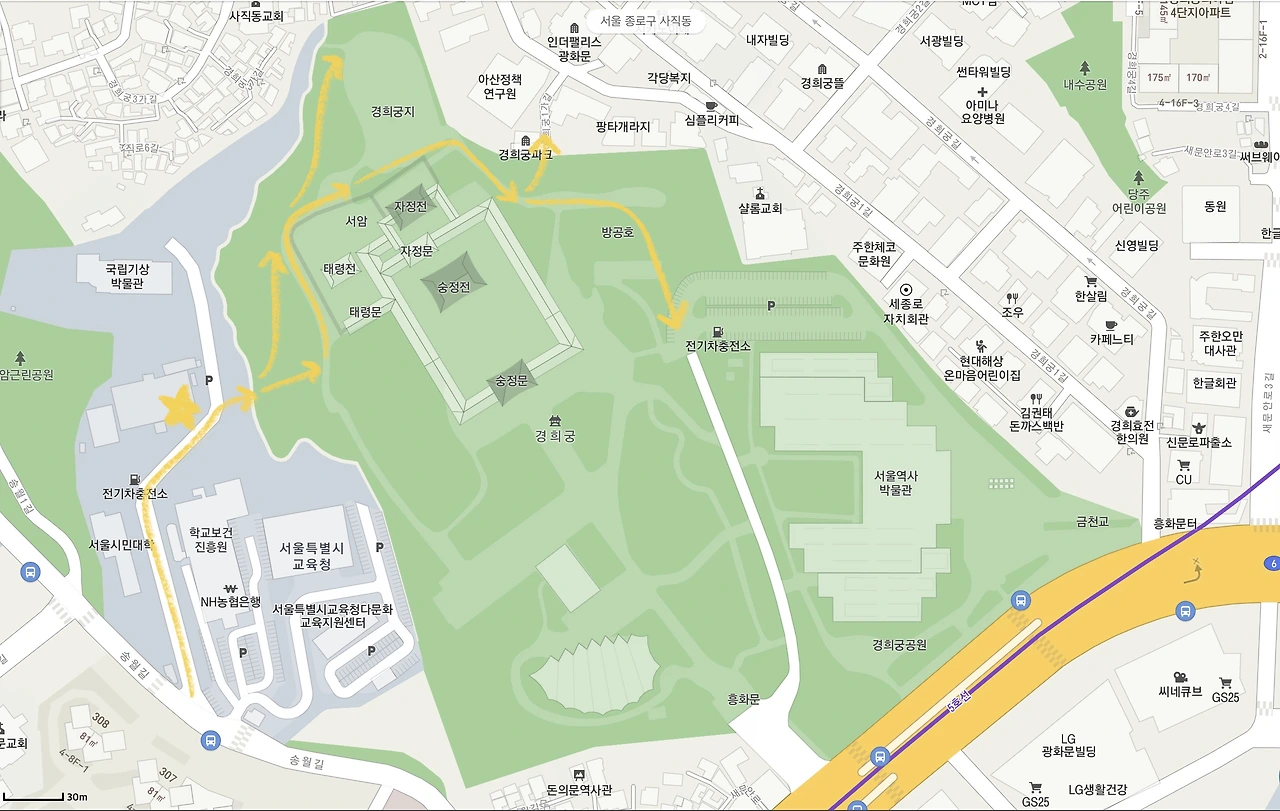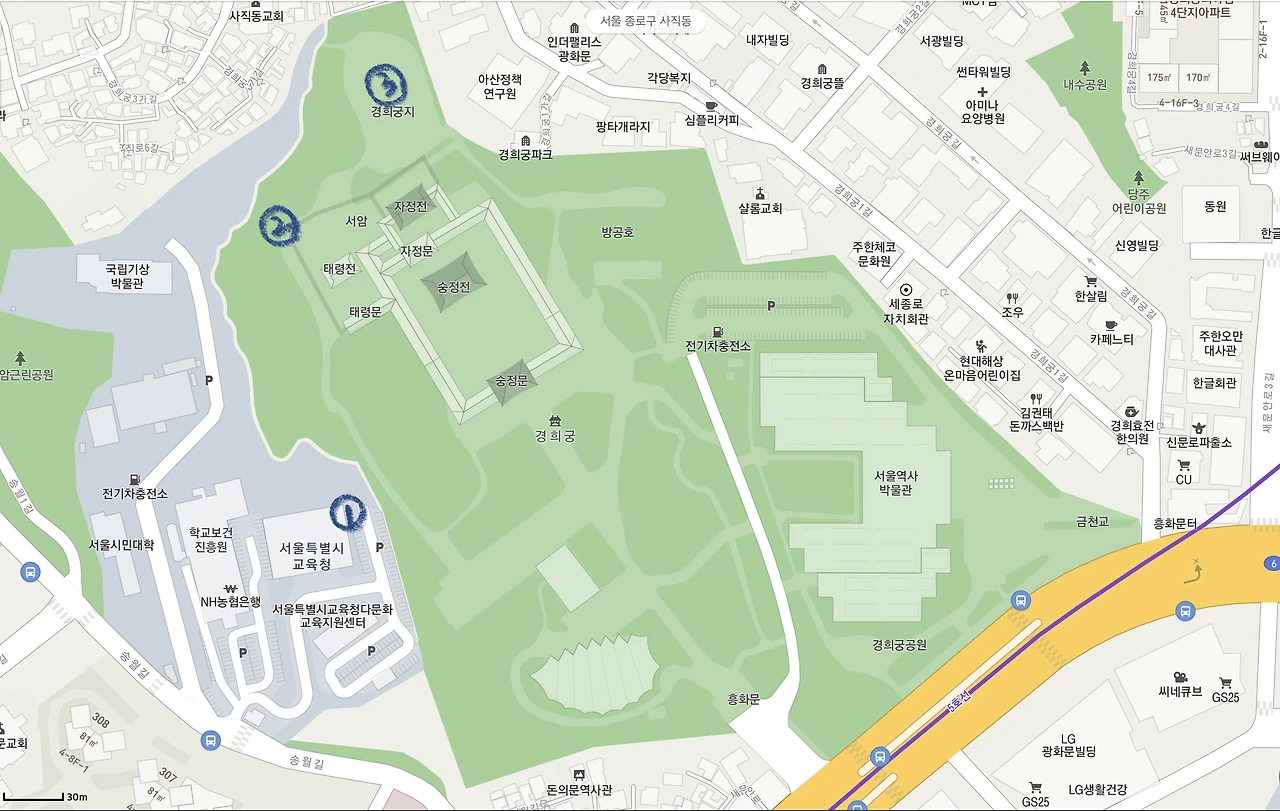 숲길을 따라 발길 닿는데로 걷다보면, 경희궁의 무성한 기와들과 빌딩숲이 한데 어우러진 풍경을 볼 수 있다.