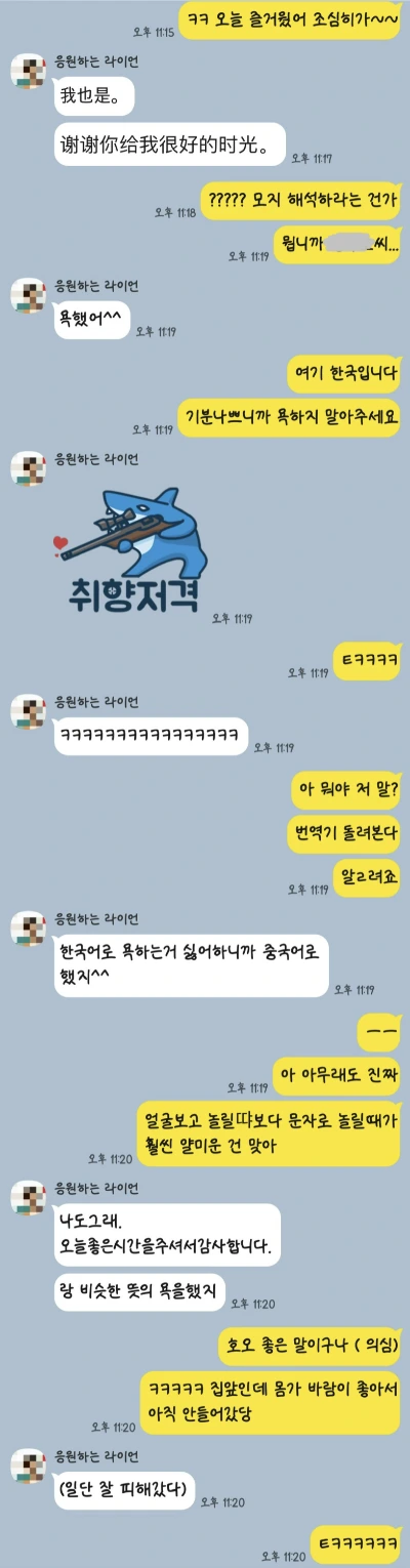 한여름 이른 저녁에 만났던 우리는 원래 밥만 먹고 카페에서 이야기를 나누다 바로 인사하고 헤어질 생각이었다. 그런데 아무래도 그러기엔 아직 날이 너무 밝았다. 아쉬움에 이곳저곳을 함께 거닐다 식당에 들어가 뒤늦은 2차를 하며 다양한 주제의 이야기를 나눴다. 즐거웠던 만남에 그날밤 나는 먼저 연락을 보냈고, 중국어를 좀 할 줄 알던 장난기 가득한 너는 이런 답을 해왔다.