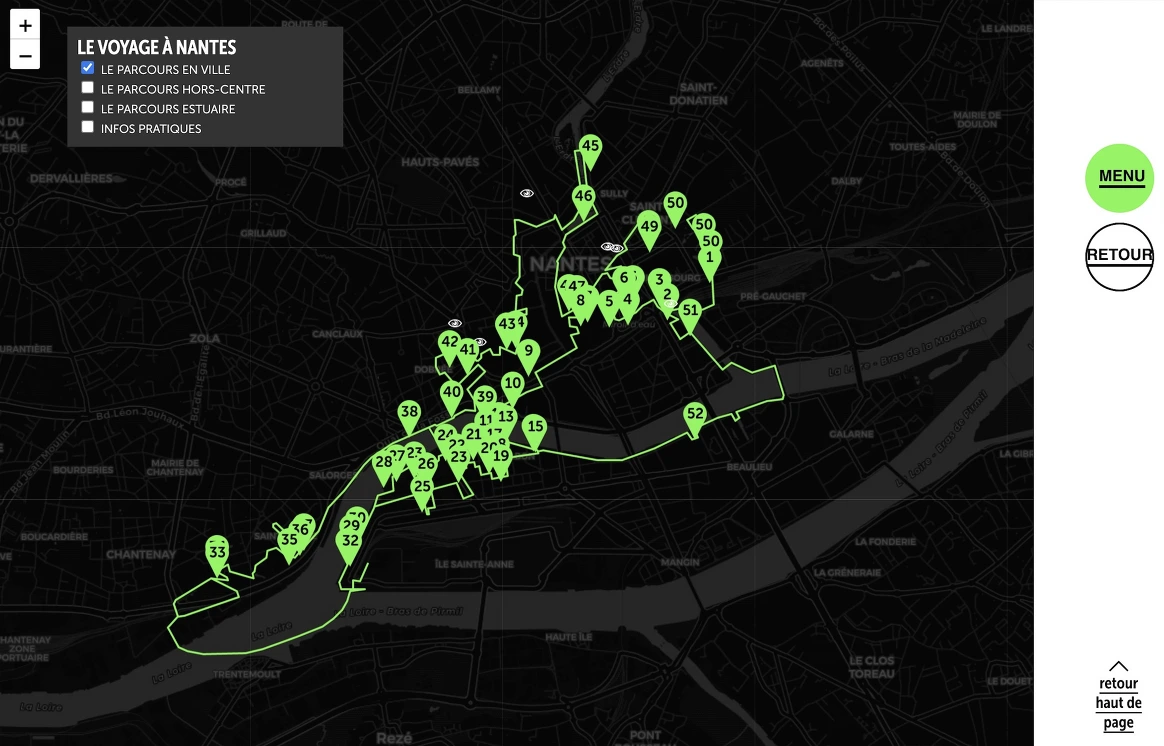 낭트 관광청 홈페이지에 들어가면 그린 라인 루트를 한눈에 확인할 수 있다. 각 번호들이 표시된 곳에는 장소에 대한 설명이 적힌 표지판이 있다. 덕분에 지도가 없이도 이 선을 따라다니며 여행할 수 있다. 디지털 맵이 아닌 거리에 직접 라인을 그려 관광루트를 표시하는 방식이 예술도시 낭트의 분위기를 보여주는 것 같기도 하다.