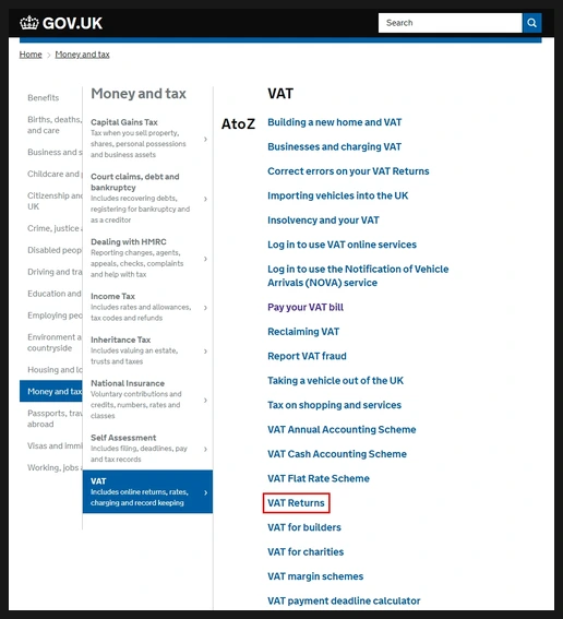잠시 새로운 브라우저 탭을 열어서 gov.uk (HMRC) 사이트에 접속합니다 (내 VAT 번호가 뭔지, 그리고 납부해야 할 금액이 얼마인지 미리 숙지해두기 위함입니다). 사이트에서 Money and Tax 메뉴로 접속합니다.