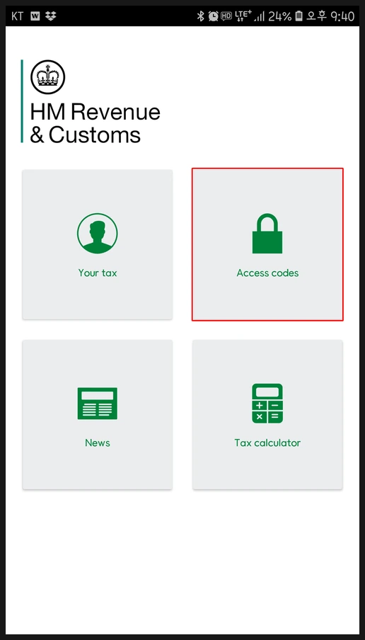 휴대폰에서 보이는 모습입니다. HMRC 어플을 설치하면 위와 같은 화면이 보이는데, 아까 언급했듯이 Access Codes를 클릭합니다.