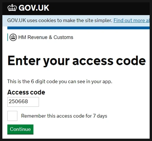 HMRC도 보안에 철저해서 이렇게 2차 인증을 해주어야 합니다 (혹시 모르시는 분들이 있을까 봐 설명드리지만, 위 Access Code는 HMRC 어플을 깔면 확인할 수 있습니다. 이것 또한 gov.uk 계정을 처음에 생성할 때 다 세팅하는 것들입니다).