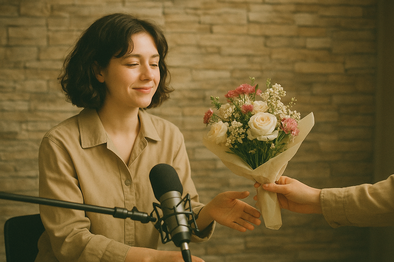 팟캐스트를 녹음하는 장면부터 하고 싶어요. 첫 녹음을 축하한다고 마크가 꽃다발을 저에게 줄 거에요. 그럼, 그 꽃다발을 받은 다음 테이블 위에 놓고는 가방 속에 들어있던 책들과 노트를 꺼내 놓는거죠.
