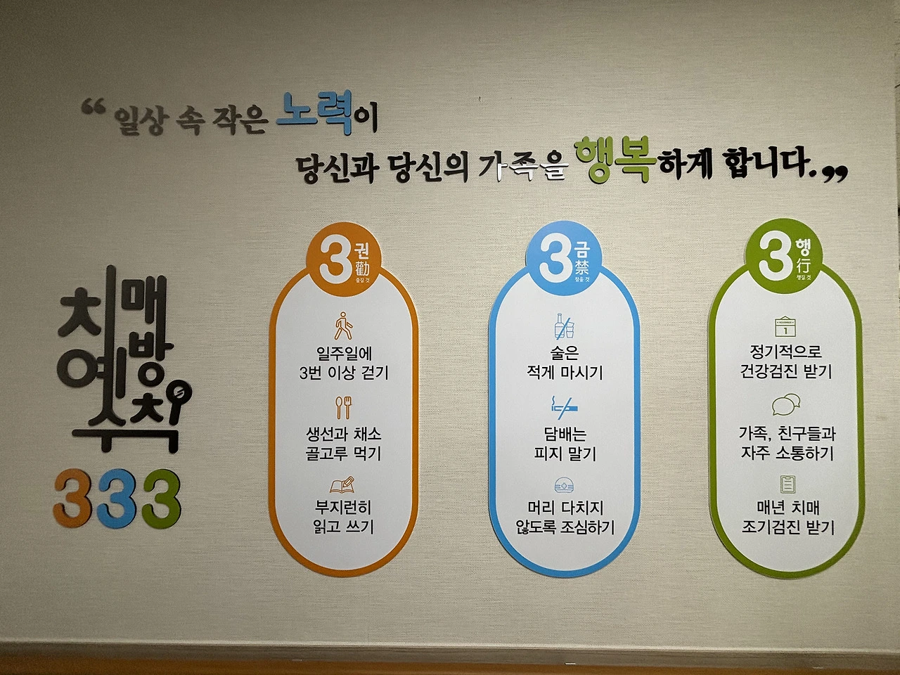 3행(行) 챙길 것 : 정기적으로 건강검진 받기, 가족, 친구들과 자주 소통하기, 매년 치매 조기검진 받기