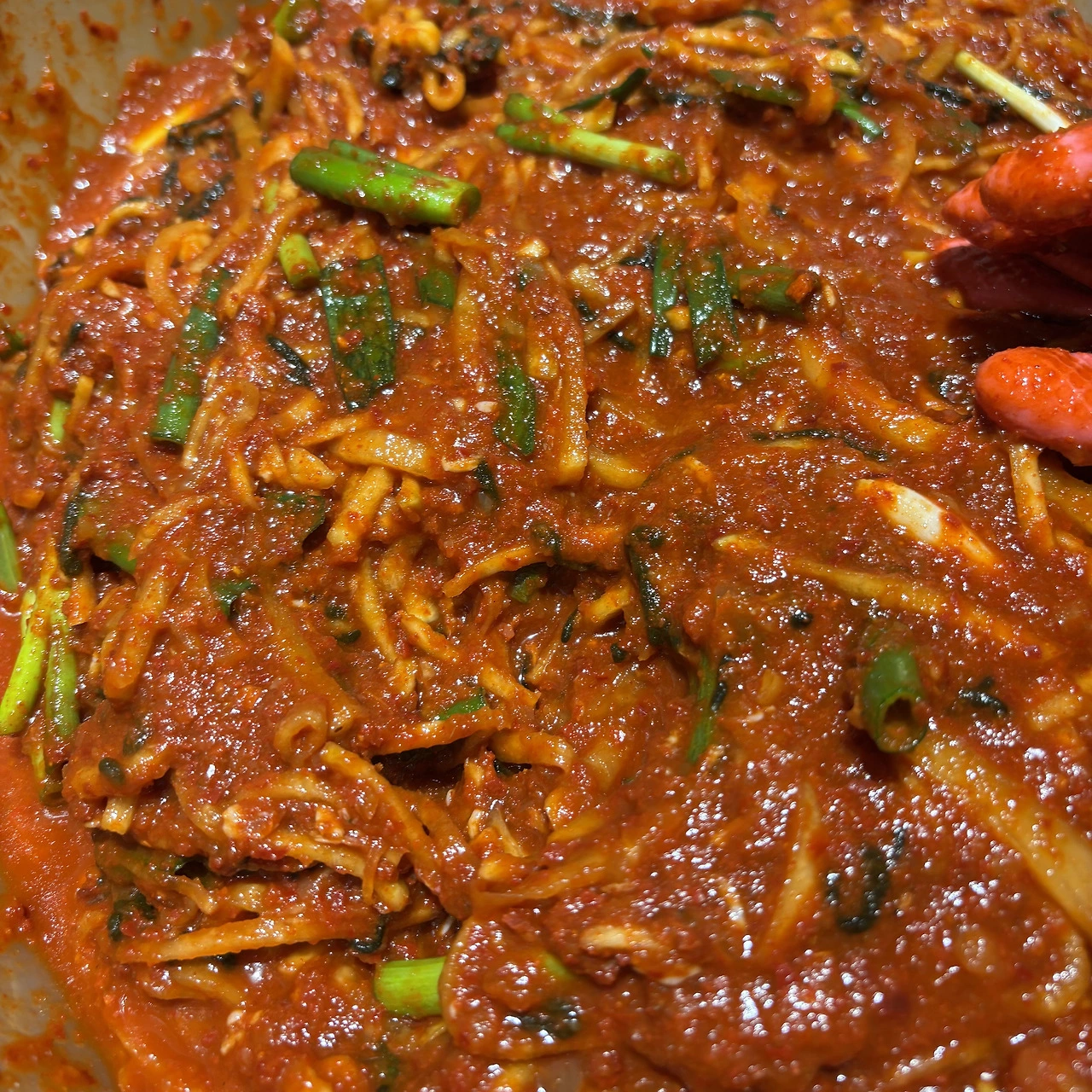동생과 나는 엄마의 지휘 아래 무를 채썰고, 파와 청각, 고춧가루, 마늘, 생강, 멸치액젓, 까나리액젓, 새우젓, 찹쌀풀을 버무려 속을 만들고, 물기 뺀 절임배추 사이사이에 고운 빛깔의 김치 속을 켜켜이 넣었다.