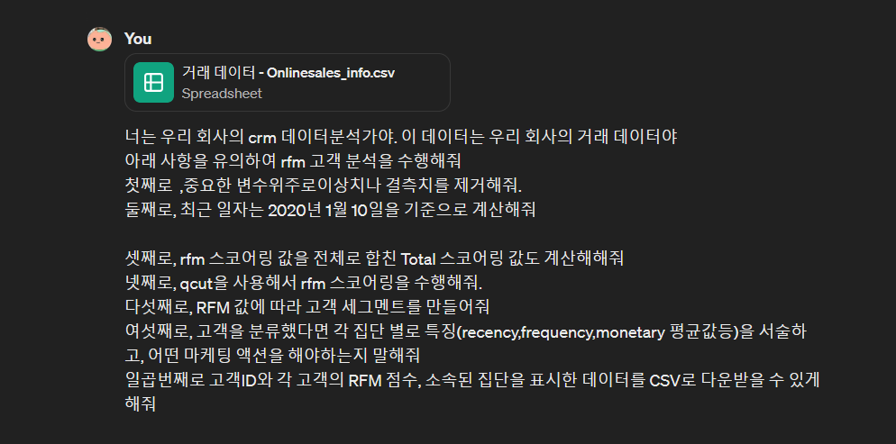 chat gpt에게 고객 데이터 분석가라는 역할을 부여한 뒤에 아래 사항에 유의하여 rfm 프로젝트를 진행하도록 하였다. 추가한 사항은 실제 rfm 분석을 하면서 유의해야할 점들을 반영하도록 프롬프트를 작성했다.