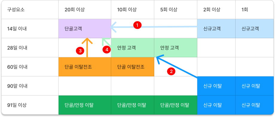 아래는 RFM 중에서 R과 F를 이용하여 2차원으로 사용자를 세분화한 것이다. 1번과 2번의 경우우 신규고객을 단골고객이나 안정 고객으로 만들기 위해, 신규 대상 무료 배송 쿠폰이나 구매 횟수별 쿠폰을 제공한다. 혹은 첫 구매 후 감사인사를 보내는 것도 좋은 방법 중 하나이다.