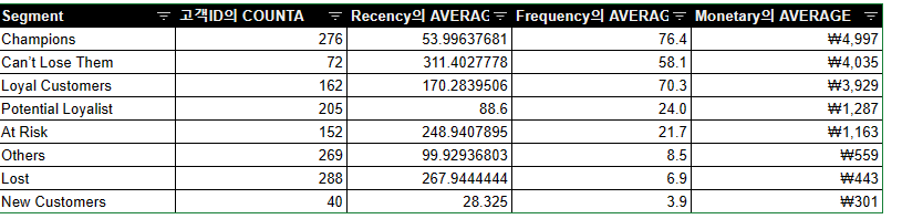 데이터를 다운받아서 엑셀로 확인해보았다. 각 집단별 숫자와 평균 RFM 변수들을 확인할 수 있었다. potentail loyalty 그룹이 규모도 크고 moneytary도 높으며 recency도 new customer와 크게 차이 나지 않음으로 이 대상자들을 champion으로 만들기위해 별도의 쿠폰 캠페인을 기획할 것 같다.