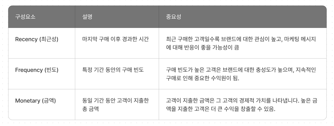 이번장에선 제일 먼저 RFM 방법론에 대해 설명하고자 한다. RFM 방법론은 고객의 구매 행동을 분석하는 데 사용되는 가장 기본적이고 일반적인 방법론이다. RFM의 약자는 Recency (최근성), Frequency (빈도), Monetary (금액) 의 세 가지 주요 요소를 기반으로 한다.각 요소의 정의에 대해 아래처럼 정리해봤다.