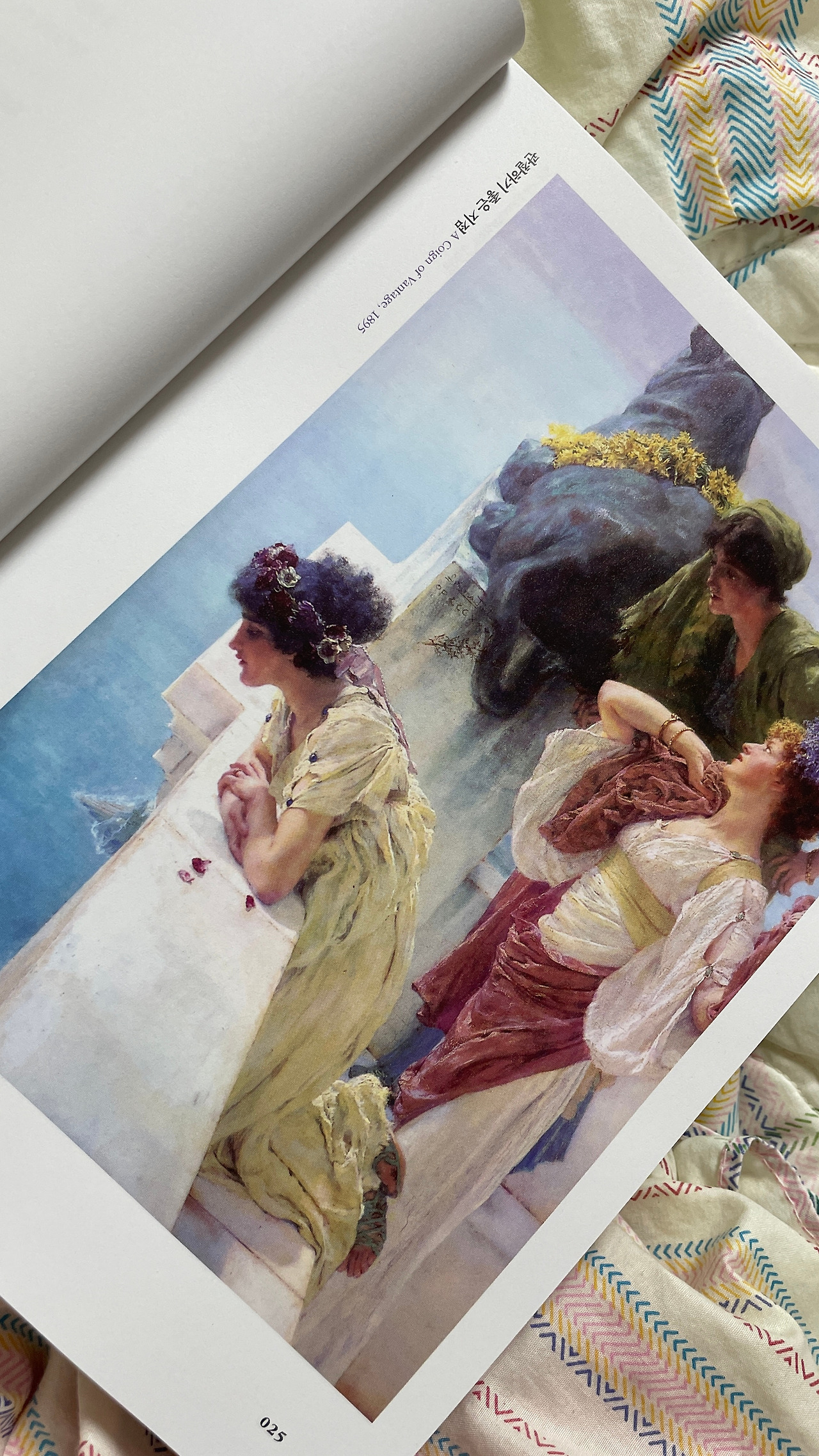 이 책 안에서 나의 취향을 어느 정도 찾아가고 있다. 나는 화사한 꽃 그림이 좋다. 꽃무늬 원피스 를 좋아하기도 하는데, 아름다운 화관을 쓴 여인들과 용환적인 분위기를 창조해내는 로렌스 알마 타데마 화가의 작품들을 자연스럽게 유심히 바라보게 되었다. 대리석으로 된 높은 건축물에서 아 래를 바라보는 듯한 장면인 <관찰하기 좋은 지점>은 마치 여신들이 열심히 하루를 살아내는 현 실 세계의 사람들을 위에서 여유롭게 웃으면서 바라보는 것처럼 다가온다.